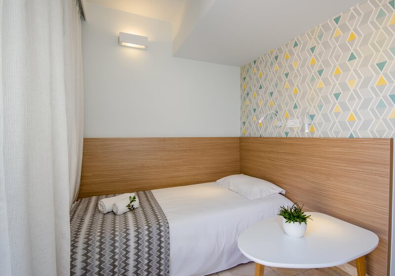 Mezonet (MA4/MA5/MA6, cca 43 m2; pod HER621, do 01.11.25), obývacia/spacia časť na 2 poschodiach, klimatizácia, minichladnička, kávovar/čajník, TV, Wi-Fi, trezor. 2 kúpeľne s vaňou alebo sprchovacím kútom, WC, sušič vlasov. Balkón s čiastočným výhľadom na more. Max. 6 osôb