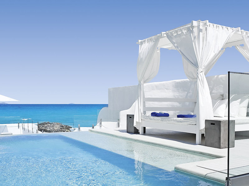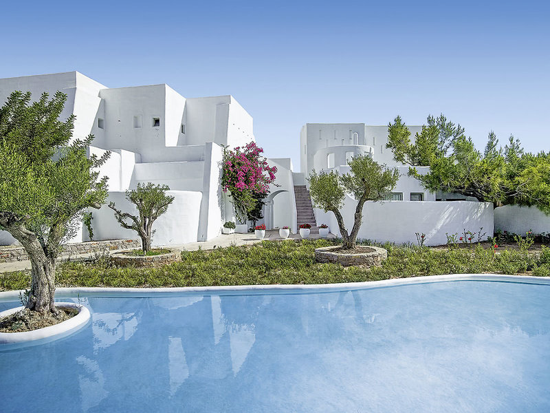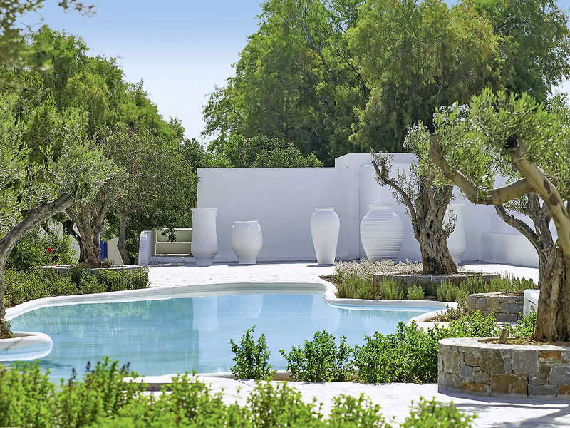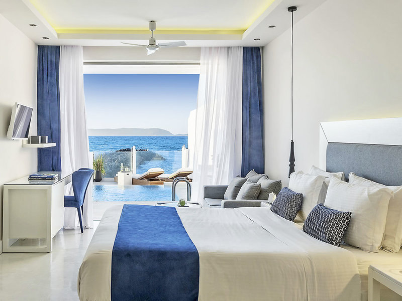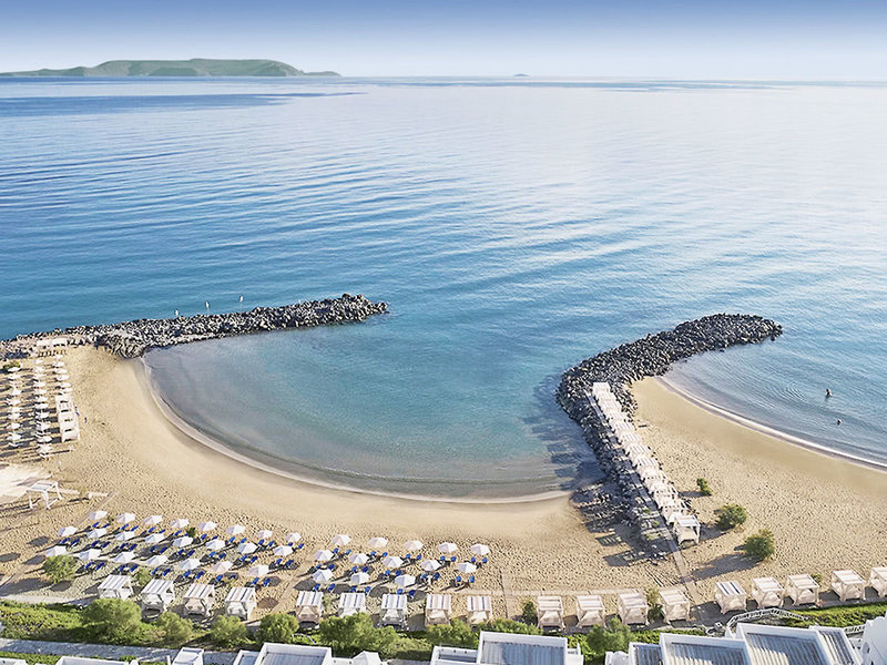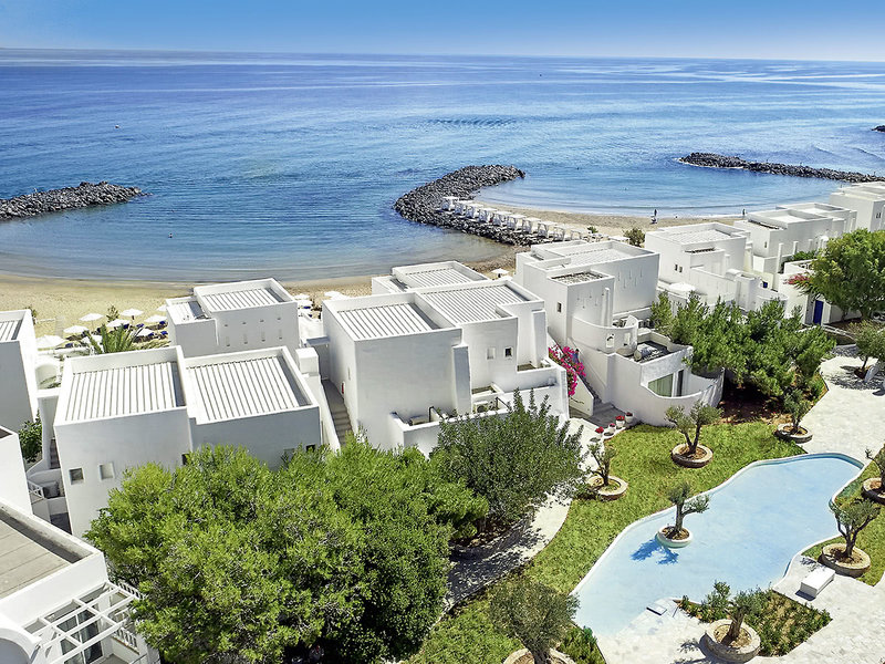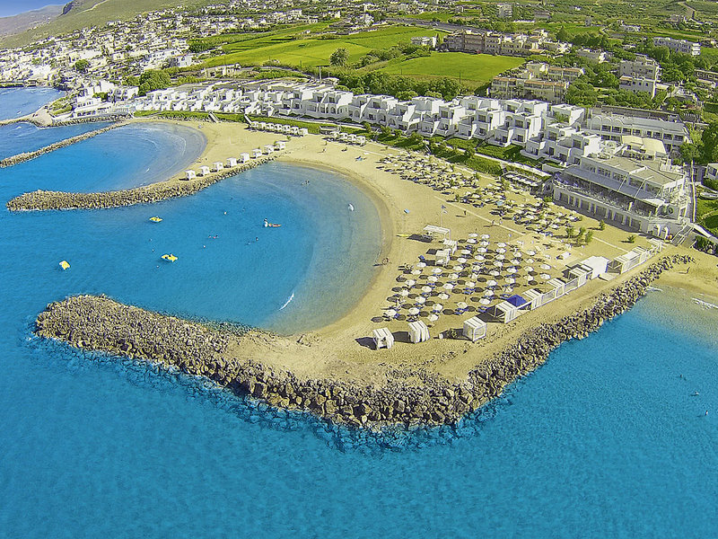 Ausstattung: Luxuriöses Strandhotel im griechischen Dorf Stil mit einem schön angelegten Garten, 2 Pools, Liegen und Schirme am Pool/Strand inklusive (Pavillon bei Suiten SUG & SUS), Poolbar. Rezeption mit Aufenthaltsbereich, TV, Lobbybar, WLAN, 3 Restaurants (Hauptrestaurant Yefsis, das Romantik-À-la-carte-Restaurant Swell mit kretischer Gourmetküche und das À-la-carte-Restaurant SiLa mit griechisch-asiatischer Fusionsküche). Landeskategorie: 5 Sterne, 133 Zimmer.
