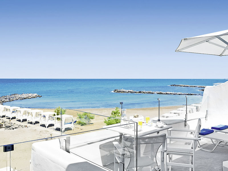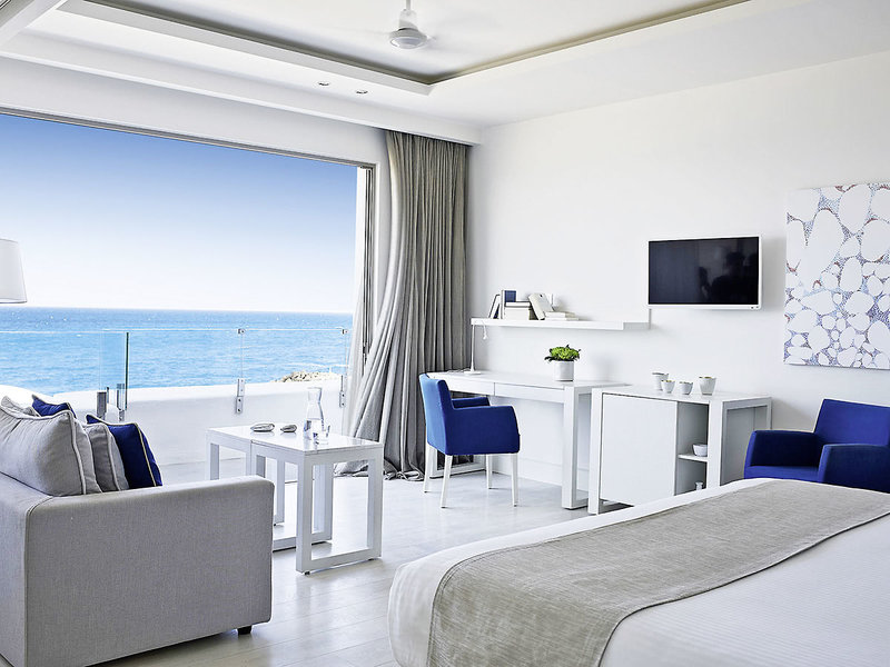 Seafront-Suiten (SUF, ca. 40 qm; unter HER377), in 1. Strandreihe, renoviert, Klima, Minibar (1 Flasche Wasser und Softdrinks bei Ankunft), Espressomaschine, TV (32 Zoll), Telefon, Musikanlage, WLAN, Safe, Bad/Dusche, WC. Balkon/Terrasse mit Meerblick. Max. 2E+1K