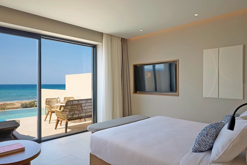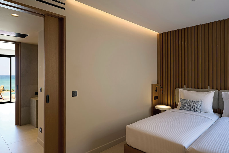 - 46-50 qm, Suite, Meerblick (zum Teil seitlich), 1 separates Schlafzimmer, Doppelbett (Kingsize), 2 Sofabetten, 1 Bad, Dusche, bodengleiche Dusche, WC, Bademantel, Badeslipper, Haartrockner, Kosmetikspiegel, Klimaanlage, Minibar kostenpflichtig, Safe, Bügelbrett, Bügeleisen, TV (Flachbildschirm), Bluetooth-Lautsprecher, Kaffeemaschine, Kaffee/Tee, Terrasse (möbliert), direkter Poolzugang, Privatpool