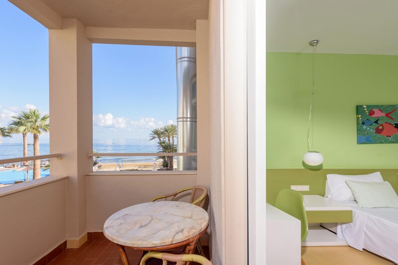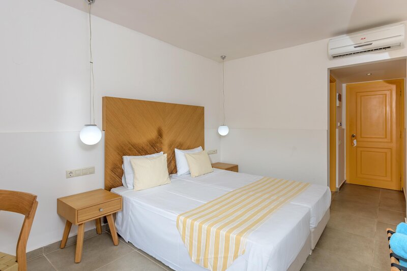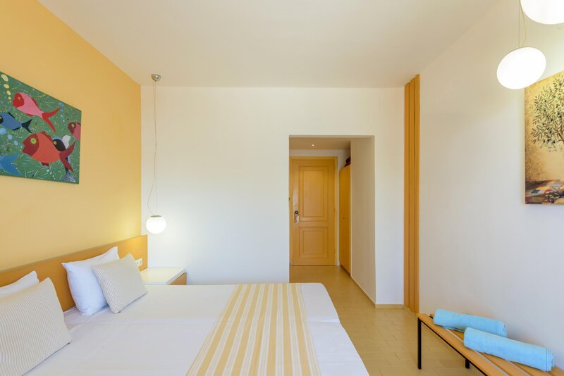 Wohnen: Doppelzimmer (DZ, DZ3, ca. 28 qm), Klimaanlage, Kühlschrank, TV, Safe. Dusche, WC, Föhn. Balkon/Terrasse, wahlweise mit Poolblick (DZP, ab 01.05.25), seitl. Meerblick (DSM) oder direktem Meerblick (DZM). Max. 2E/3E