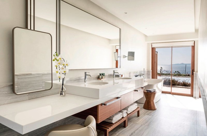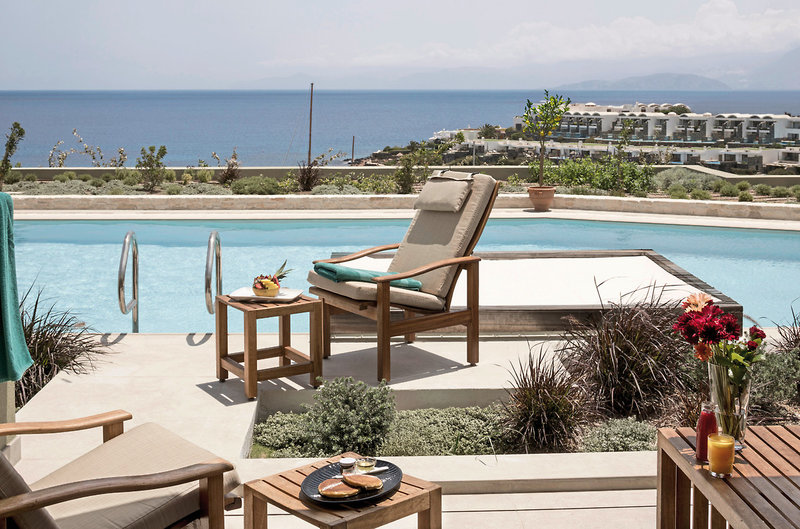 - 41-45 qm, Juniorsuite, Meerblick, Sitzecke, 1 Doppelbett (Kingsize), 1 Bad, Tageslichtbad, Dusche, Badewanne, WC, Bademantel, Badeslipper, Haartrockner, Klimaanlage, Minibar, Safe, TV, Kaffee/Tee, Terrasse (möbliert), Privatpool, Kopfkissen-Menü