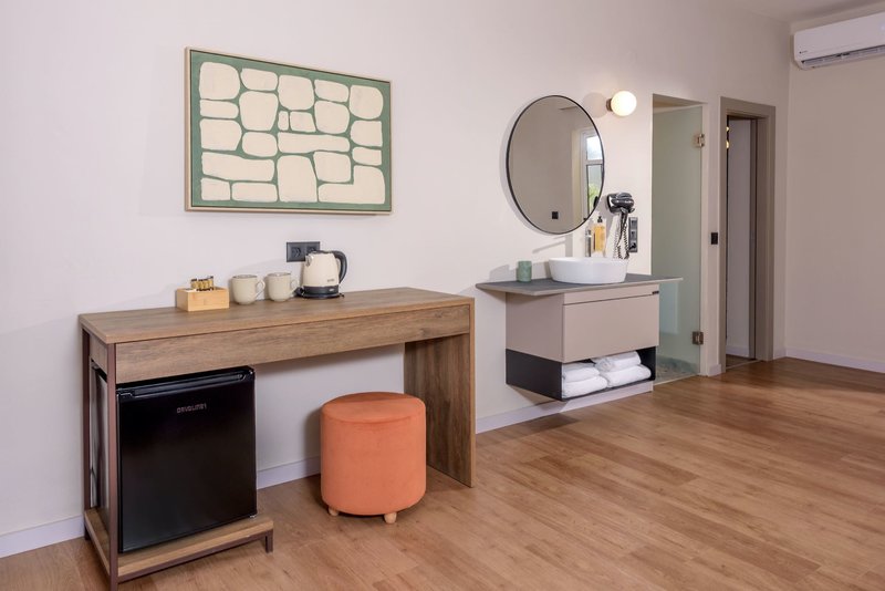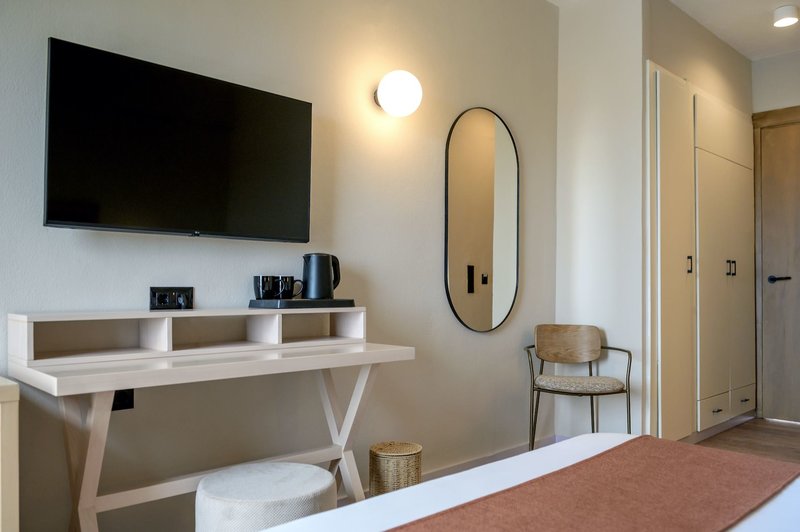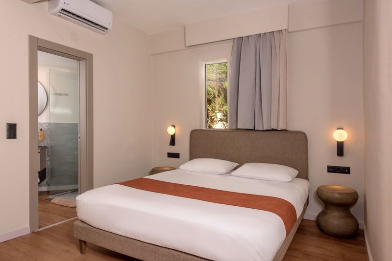 Doppelzimmer: Verfügen über Bad oder Dusche/WC, Föhn, Telefon, Sat.-TV mit Musikkanal, Mietsafe, Klimaanlage, Bademäntel und Hausschuhe, Minikühlschrank, Wasserkocher mit täglicher Auffüllung von Kaffee, Tea, Milch und Zucker, Wi-Fi (kostenlos) sowie Balkon oder Terrasse (D). Bei Ankunft steht eine Flasche Wasser im Zimmer bereit. Wahlweise auch zur Alleinnutzung buchbar (DE).