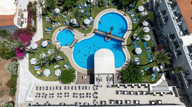 Hlavná budova ponúka priestrannú vstupnú halu s 24-hodinovou recepciou, výťah, kútik so satelitnou televíziou a bezplatné Wi-Fi pripojenie na internet, ako aj hlavný bar a bufetovú reštauráciu s vonkajšou časťou, ktorá ponúka široký výber tradičných jedál. V dobre udržiavanom areáli nájdete tri bazény s bezplatnými ležadlami a slnečníkmi, bar pri bazéne a aquapark s rôznymi toboganmi (otvorený šesť dní v týždni, 150 metrov od hotela). Ležadlá a slnečníky sú k dispozícii za poplatok na pláži.