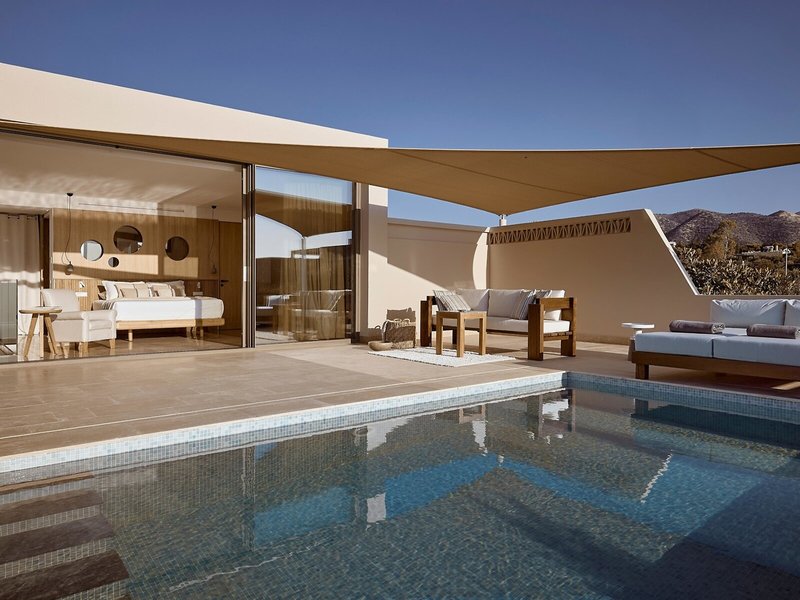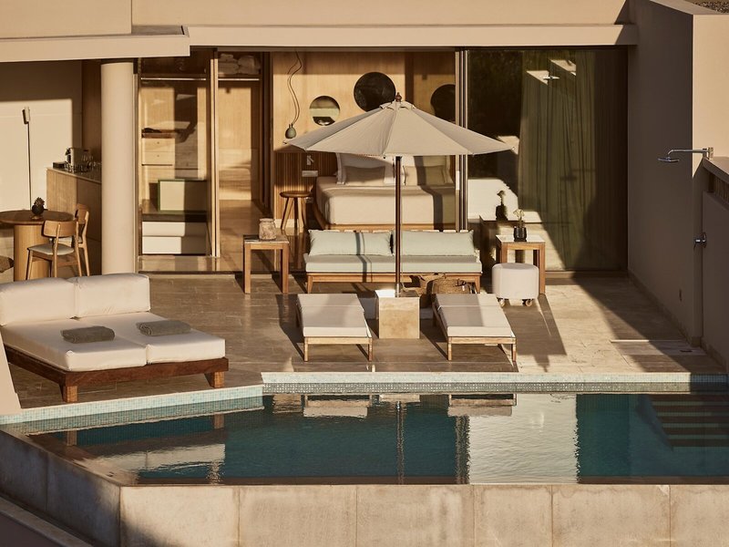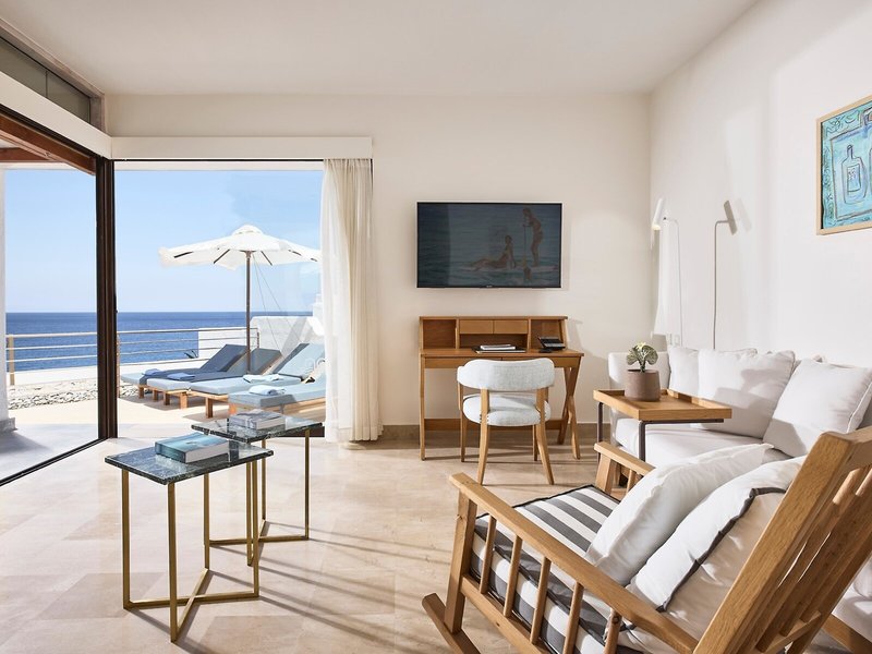 - Club – Studio Seafront Private Pool (JSM3), Studio, erste Strandreihe, Meerblick, Buchtblick, ca. 50 m², letzte Komplettrenovierung 2022, letzte Teilrenovierung 2025, Gesamtanzahl der Räume in diesem Zimmertyp: 1, Aufteilung wie folgt: kombiniertes Wohn-/Schlafzimmer, 1 Doppelbett (190x200cm), 1 Schlafsofa (65x170cm), Klimaanlage: ohne Gebühr, individuell regelbar, kalt, warm, Fußboden: Fliesenboden, Safe: ohne Gebühr, Sitzecke, Sofa, Schreibtisch, Nespressomaschine, Kaffee-/Teezubereiter, Esstisch, Minibar: gegen Gebühr, Softdrinks: gegen Gebühr, Wasser: gegen Gebühr, alkoholische Getränke: gegen Gebühr, Snacks: gegen Gebühr, Minibarauffüllung: täglich, Telefon, Internet: WLAN/WiFi: ohne Gebühr, Fernseher: Flatscreen, im Wohnbereich, im Schlafzimmer, deutsches Programm, Sat-TV, Roomservice: 07:45 Uhr - 23:00 Uhr, gegen Gebühr, Reinigungsservice: täglich, ohne Gebühr, separate Dusche, Badewanne, separates WC, Bademantel: ohne Gebühr, Slipper: ohne Gebühr, Föhn, Kosmetikspiegel, Terrasse: mit Liegestühlen, mit Liegen, mit Sitzgelegenheit, mit Private Pool