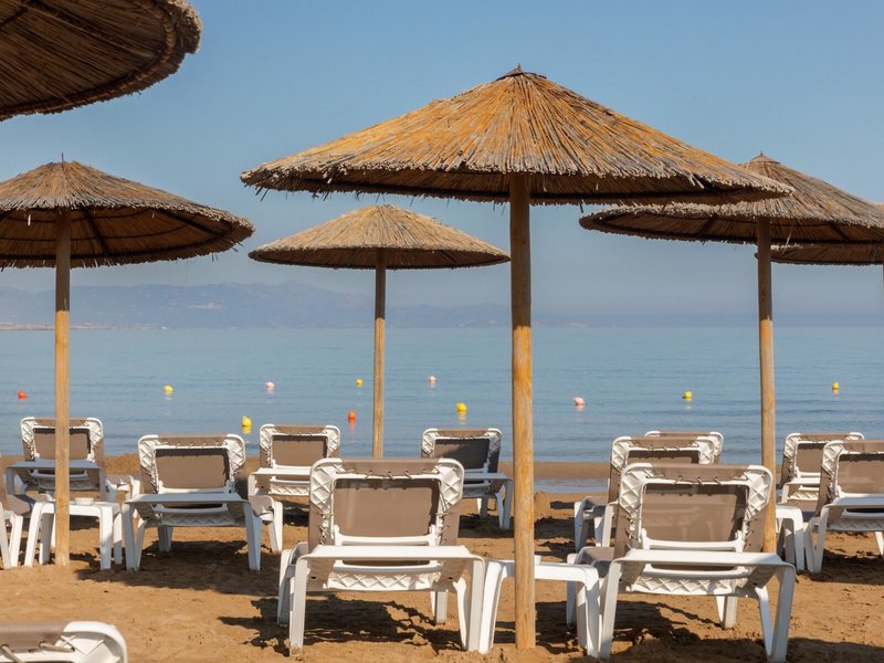 - Strand: Sand, flach abfallend, Liegestühle, Sonnenschirme