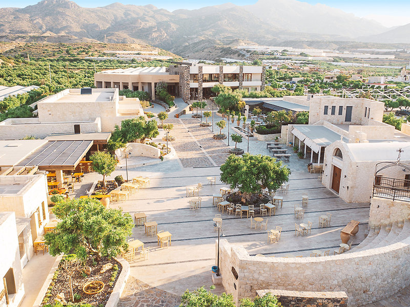 Ausstattung: Das von der traditionellen kretischen Bauweise inspirierte Resort ist in eine große, traumhaft gepflegte Gartenlandschaft eingebettet. 6 Pools (Fun-, Action-, Kinder- und Ruhepools), Sonnenterrassen, Liegen und Schirme, Pool-, Beach- und Snackbars, Dorfplatz mit Boutique, Souvenirshop, Café, Rezeption mit Lobby und Sitzecke, WLAN, 4 Bars und 6 Restaurants. Mehrere Gebäude, Lift, Landeskategorie: 5 Sterne, 348 Zimmer.