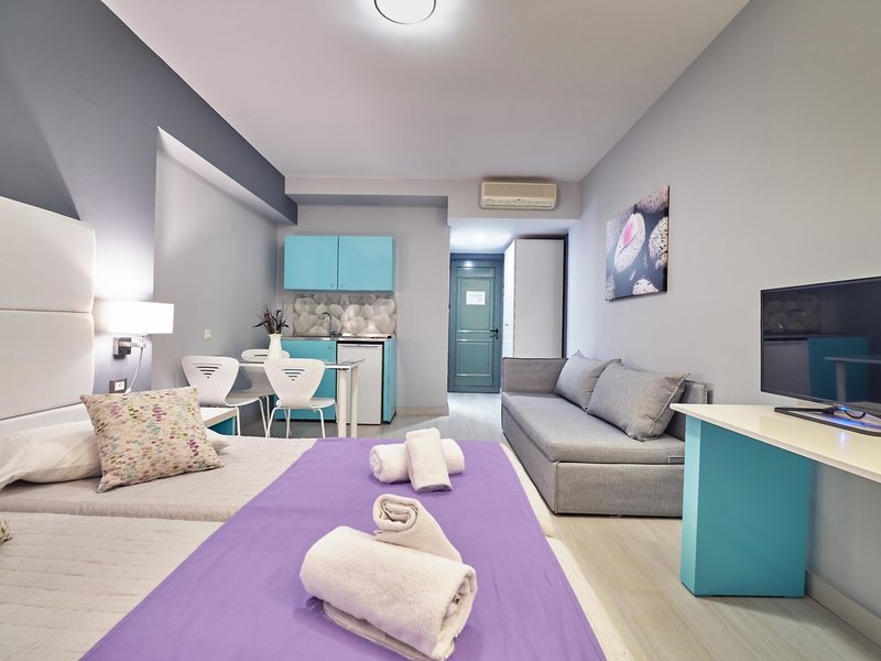 - Štúdio (STX1), Štúdio, Pri bazéne, Pri záhrade, Výhľad na bazén, Výhľad do záhrady, cca 28 m², posledná kompletná rekonštrukcia 2017, posledná čiastočná rekonštrukcia 2026, kombinovaná obývacia izba/spálňa, 2 samostatné postele (90x200cm), 1 rozkladacia pohovka (90x200cm), klimatizácia: bezplatne, individuálne ovládaná, podlaha: laminátová, trezor: bezplatne, pohovka, kuchynský kút, chladnička: bezplatne, telefón, internet: Wi-Fi: bezplatne, TV: satelitná TV, sprcha, fén, balkón alebo terasa: s posedením, terasa: s posedením