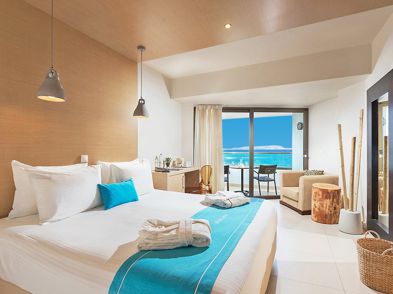 Cool-Doppelzimmer (DZB, ca. 24 qm), Klima, Kühlschrank, Kaffee-/Teezubereiter, TV (32 Zoll), Telefon, WLAN, Safe. Bad, WC, Föhn. Terrasse mit Meerblick, Swim-up-Pool. Max. 2E