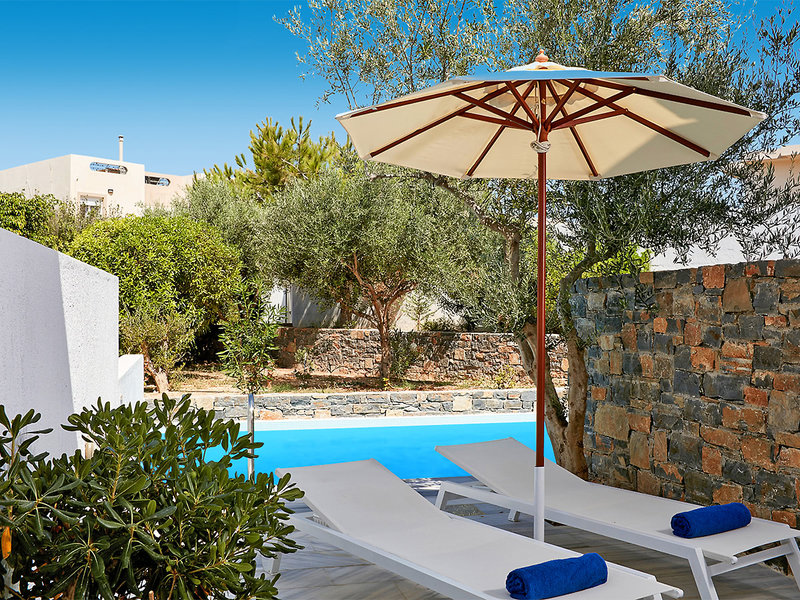 Pool Cool-Doppelzimmer (DZA, ca. 28 qm), Klima, Kühlschrank, Kaffee-/Teezubereiter, TV (32 Zoll), Telefon, WLAN, Safe. Bad, WC, Föhn. Terrasse mit Meerblick, Sharingpool. Max. 2E