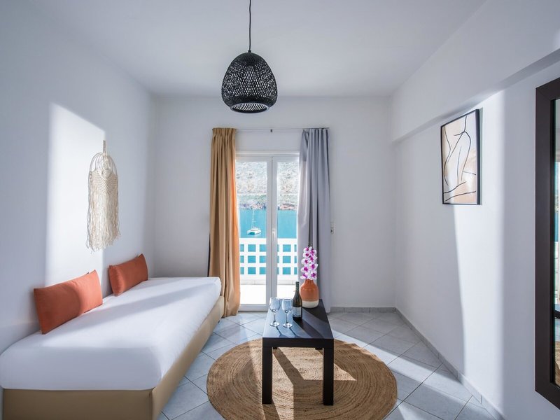 - Deluxe Studio Sea View (STM1), im Hauptgebäude, Meerseite, Meerblick, ca. 15 - 28 m², letzte Komplettrenovierung 2019, kombiniertes Wohn-/Schlafzimmer, 2 Einzelbetten, Klimaanlage: individuell regelbar, kalt, warm, Heizung: individuell regelbar, Fußbodenheizung, Fußboden: Fliesenboden, Kochnische, Kühlschrank, Wasserkocher, Internet: WLAN/WiFi, Fernseher: Flatscreen, deutsches Programm, Sat-TV, Reinigungsservice, Dusche, Regendusche, WC, Föhn, Kosmetikspiegel, Balkon: mit Sitzgelegenheit, Balkon oder Terrasse: mit Sitzgelegenheit, Terrasse