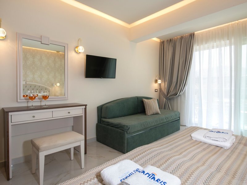 - Panorama Double room (DZM3), Doppelzimmer, Nichtraucherzimmer, im Hauptgebäude, Meerblick, seitlicher Meerblick, Blick auf sea, ca. 20 - 24 m², letzte Komplettrenovierung 2023, Gesamtanzahl der Räume in diesem Zimmertyp: 1, Aufteilung wie folgt: 1 Schlafzimmer, 2 Einzelbetten (90x200cm), 1 Schlafsofa (85x195cm), Babybett: pro Tag ca. 5.00 EUR, Moskitonetz, Klimaanlage: ohne Gebühr, kalt, warm, Fußboden: Fliesenboden, Safe: pro Tag ca. 2.00 EUR, bei All Inclusive inklusive, Sofa, Bügeleisen, Kühlschrank: ohne Gebühr, Kaffee-/Teezubereiter, Telefon, Internet: WLAN/WiFi: ohne Gebühr, Fernseher: Flatscreen, Reinigungsservice: täglich, Dusche, WC, Slipper, Föhn, Kosmetikspiegel, Balkon: mit Sitzgelegenheit