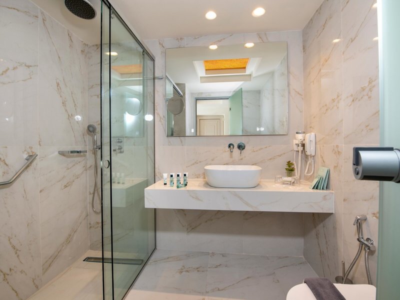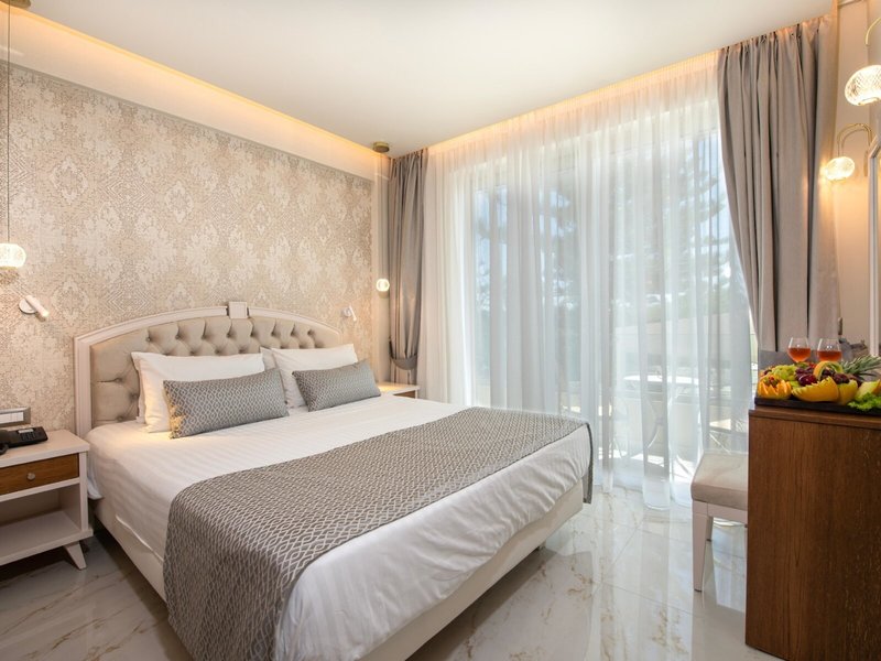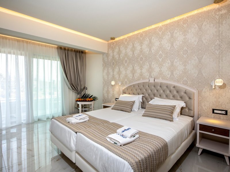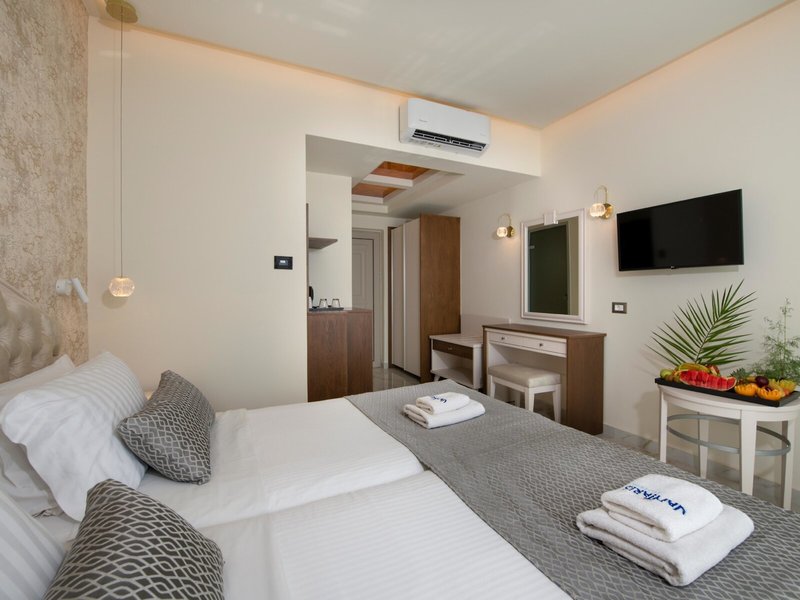- Dvojlôžková izba Superior (DZX4), dvojlôžková izba, nefajčiarska izba, morská strana, bočný výhľad na more, cca 22 - 24 m², posledná kompletná rekonštrukcia v roku 2023, celkový počet izieb v tomto type izby: 1, rozloženie: kombinovaná obývacia izba/spálňa, 1 spálňa, 2 samostatné lôžka (90x200 cm), detská postieľka: cca 5,00 EUR na deň, v cene All Inclusive, klimatizácia: bez poplatku, studená, teplá, podlaha: dlažba, trezor: cca 2,00 EUR na deň, v cene All Inclusive, chladnička: bez poplatku, kávovar/čajník, rýchlovarná kanvica, Internet: WLAN/WiFi: bez poplatku, TV: byt. zástena, Upratovacia služba: denne, zdarma, sprcha, WC, papuče: zdarma, fén, kozmetické zrkadlo, balkón: s posedením