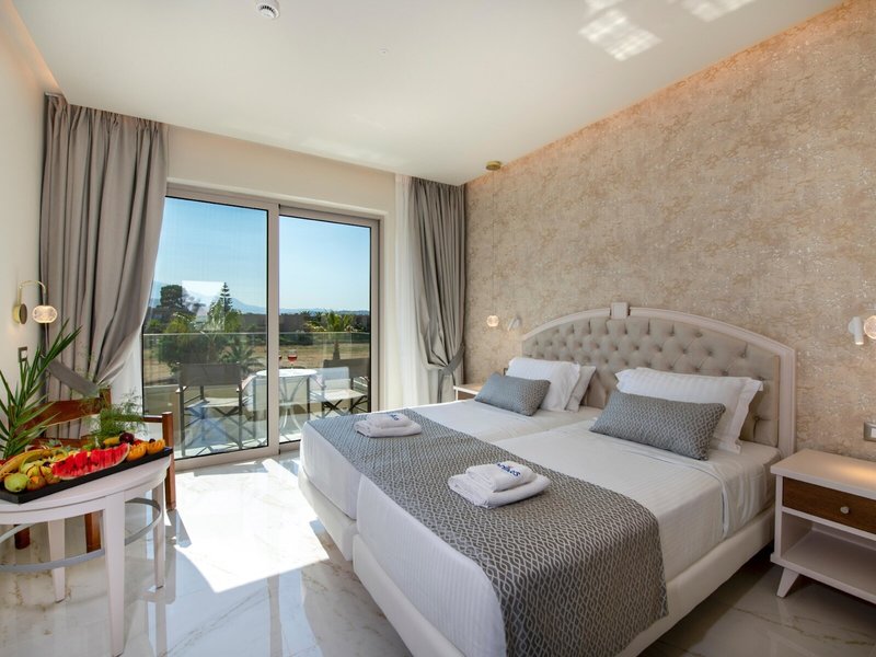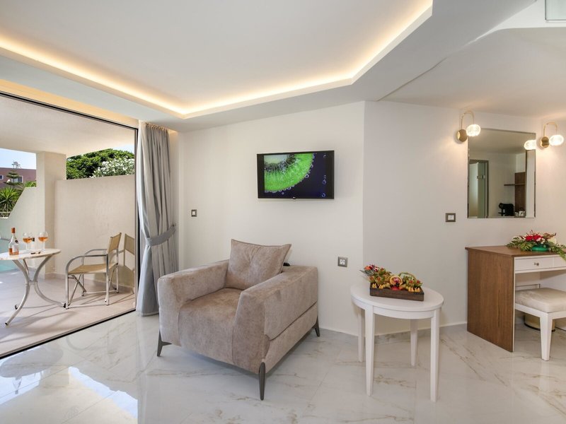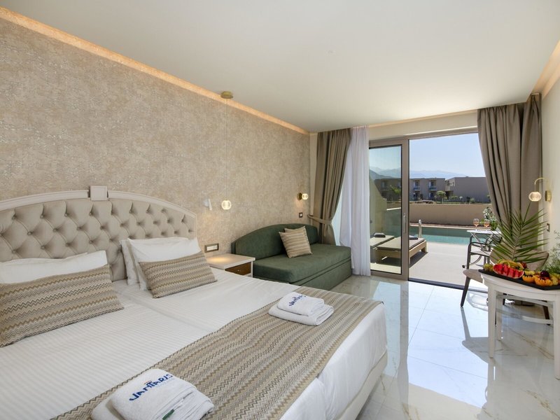 - Junior Suite WEST with pr. pool (JSX2), Juniorsuite, Nichtraucherzimmer, Westseite, Gartenblick, ca. 22 - 24 m², letzte Komplettrenovierung 2023, Gesamtanzahl der Räume in diesem Zimmertyp: 15, Aufteilung wie folgt: kombiniertes Wohn-/Schlafzimmer, 2 Einzelbetten (90x200cm), 2 Schlafsofas (85x195cm), Babybett: pro Tag ca. 5.00 EUR, Moskitonetz, Klimaanlage: individuell regelbar, kalt, warm, Fußboden: Fliesenboden, Safe: pro Tag ca. 2.00 EUR, bei All Inclusive inklusive, Sofa, Bügeleisen, Bügelbrett, Kühlschrank, Espressomaschine, Kaffee-/Teezubereiter, Wasserkocher, Internet: WLAN/WiFi: ohne Gebühr, Fernseher: Sat-TV, Dusche, WC, Bademantel, Slipper, Föhn, Kosmetikspiegel, Terrasse: mit Liegestühlen, mit Private Pool