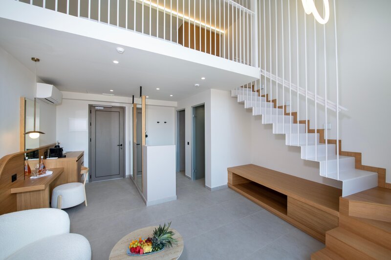 Mezonet (MA, cca 41 m2), klimatizácia, minibar (za poplatok), telefón (za poplatok), TV, WiFi, trezor na prenájom, sušič vlasov, sprcha, WC, balkón/terasa, s výhľadom na more. Maximálne 4E