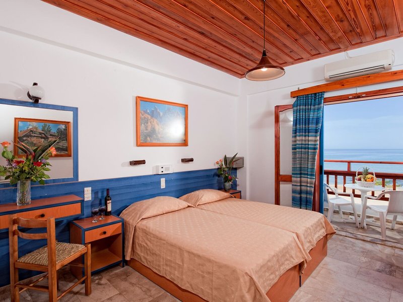 So wohnen Sie: Für angenehmes Raumklima in den Zimmern sorgen eine Klimaanlage und eine Heizung. Die Gäste können den Meerblick von Balkon oder Terrasse genießen. Die Zimmer verfügen über ein Doppelbett. Zustellbetten können angefordert werden. Außerdem sind ein Safe und eine Minibar verfügbar. Eine Kochnische mit einem Kühlschrank und einer Tee-/Kaffeemaschine ist ebenfalls standardmäßig vorhanden. Besten Urlaubskomfort bieten ein Telefon, ein TV-Gerät, ein Radio, eine Stereoanlage und WiFi (ohne Gebühr). Im Badezimmer, mit einer Dusche und einer Badewanne ausgestattet, stehen für die Gäste ein Haartrockner und Bademäntel bereit.
