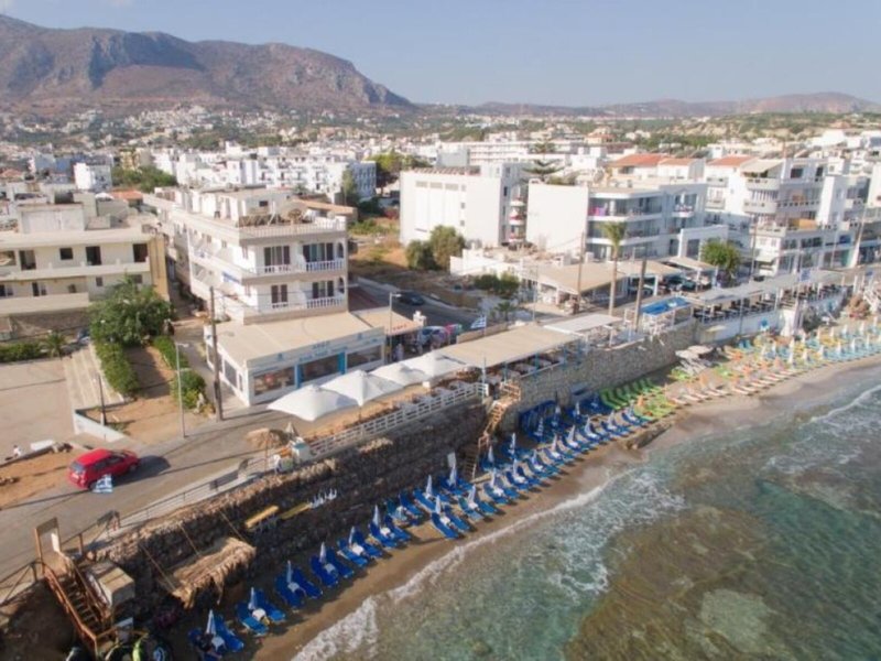 Lage & Umgebung Das Hotel befindet sich in direkter Strandlage, etwa 200 m vom Zentrum der Ortschaft Hersonissos entfernt. Umfangreiche Einkaufs- und Unterhaltungsmöglichkeiten, wie Bars und Restaurants liegen in unmittelbarer Entfernung zum Hotelgebäude. Eine Haltestelle für öffentliche Verkehrsmittel ist in wenigen Gehminuten zu erreichen, bei einer Entfernung von ca. 500 m. Das Stadtzentrum von Heraklion sowie der Flughafen der Hauptstadt Kretas liegen in einer Entfernung von etwa 25 km. Der Palast von Knossos ist nach ungefähr 20 km zu erreichen.