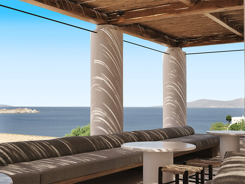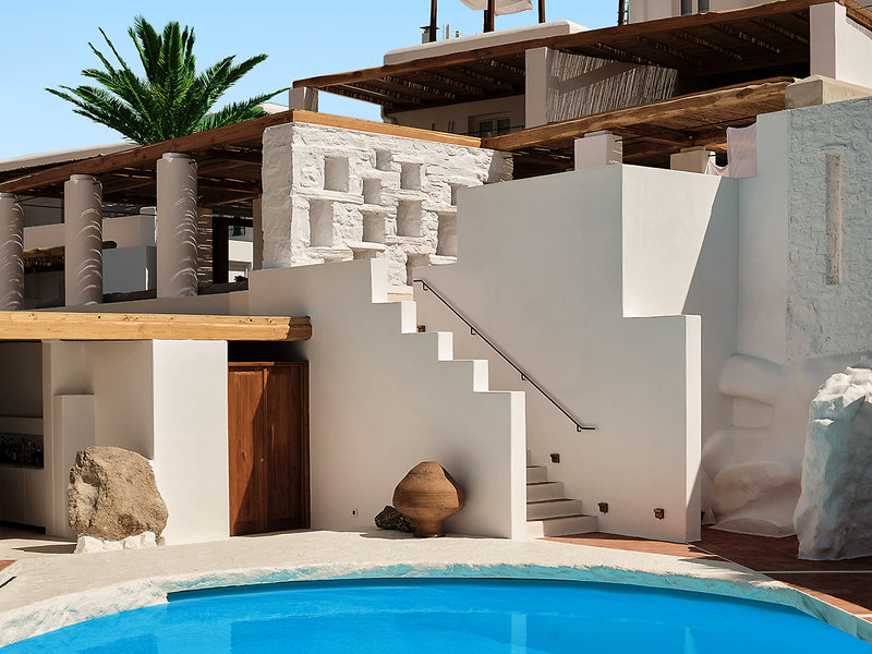 Ausstattung: Im typischen Kykladen-Stil erbautes Luxushotel mit authentischem Mykonos-Flair und herrlichem Meerblick. Im Außenbereich Swimmingpool, Sonnenterrasse. Liegen, Schirme, Badetücher am Pool, am Strand gegen Gebühr. Empfangshalle, Rezeption, Restaurant, Bar, Fitnessraum. WLAN im gesamten Hotel. Landeskat.: 5 Sterne, 27 Zimmer.