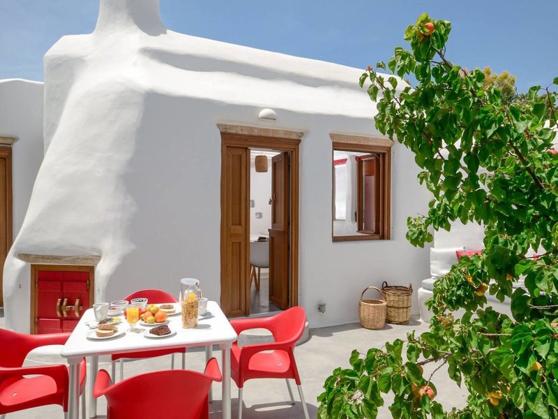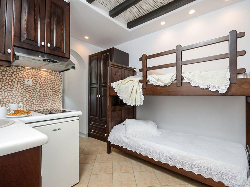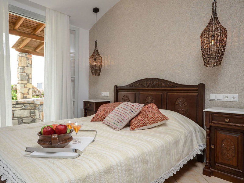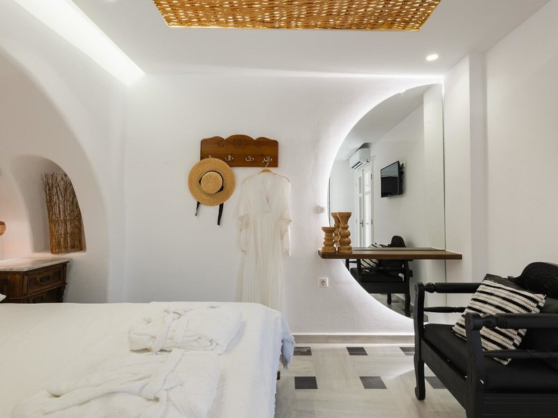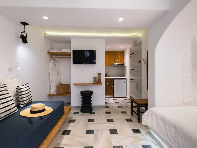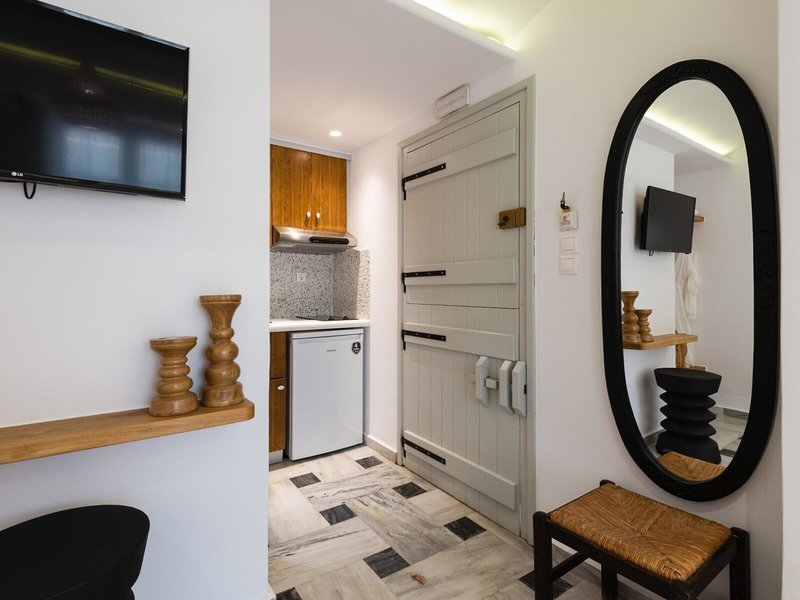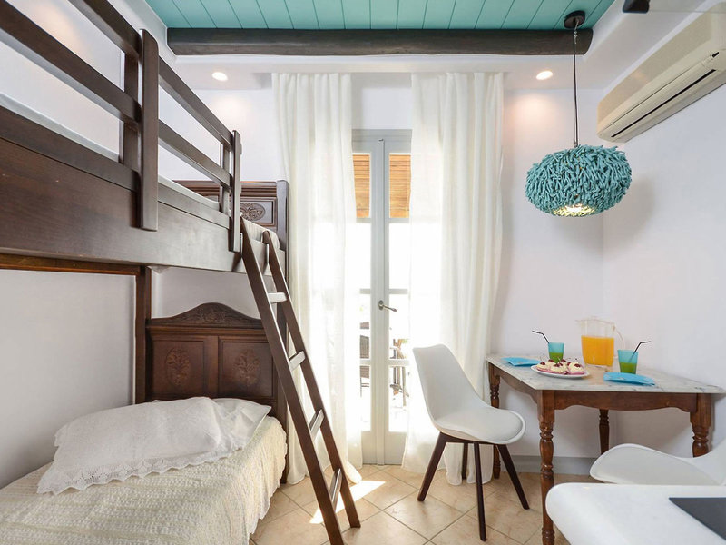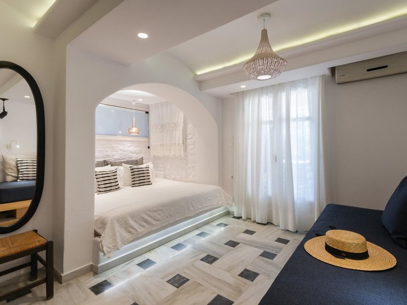 - Suita Nymfes (SUX1), štúdio, v hlavnej budove, výhľad do záhrady, cca 30 m², celkový počet izieb v tomto type izby: 2, rozloženie takto: kombinovaná obývacia izba/spálňa, 1 spálňa, 2 samostatné lôžka, dieťa detská postieľka: cca 5 EUR na deň, klimatizácia: zadarmo, individuálne nastaviteľná, trezor: zadarmo, kuchyňa, chladnička: zadarmo, varná doska, kávovar, rýchlovarná kanvica, Internet: WLAN/WiFi: za príplatok, hotovosť platba, TV: SAT TV, izbová služba: 09:00 - 22:00, upratovanie: denne, zdarma, sprcha, WC, 2 kúpeľne, fén, balkón: s posedením
