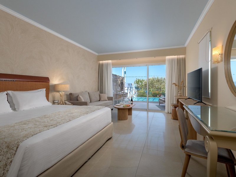 - Deluxe room sea view with pool (DZM3), Doppelzimmer, Nichtraucherzimmer, Meerblick, ca. 39 m², letzte Teilrenovierung 2023, Gesamtanzahl der Räume in diesem Zimmertyp: 1, Aufteilung wie folgt: kombiniertes Wohn-/Schlafzimmer, Babybett: ohne Gebühr, Anfrage notwendig, Klimaanlage: ohne Gebühr, individuell regelbar, kalt, warm, Safe: ohne Gebühr, Nespressomaschine, Kaffee-/Teezubereiter, Minibar: gegen Gebühr, bei All Inclusive inklusive, Minibarauffüllung: täglich, Telefon, Internet: WLAN/WiFi: ohne Gebühr, Fernseher: Flatscreen, deutsches Programm, Sat-TV, Roomservice: täglich, gegen Gebühr, Reinigungsservice: ohne Gebühr, Badewanne mit integriertem Whirlpool, WC, Bademantel: ohne Gebühr, Slipper: ohne Gebühr, Föhn, Terrasse: mit Liegestühlen, mit Sitzgelegenheit, mit Private Pool