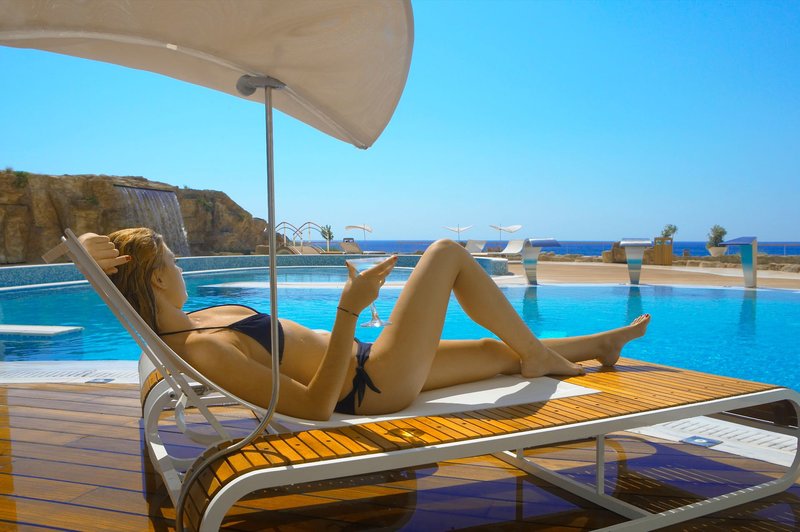 Ausstattung: Eine sehr moderne und architektonisch interessante Anlage für hohe Ansprüche, welche aus einem achtstöckigen Hauptgebäude mit Panoramaliften, einem 7-stöckigen Nebengebäude und einem 6-stöckigen Gebäude, besteht. Hochwertig und qualitativ eingerichtet und verfügen über eine Rezeption, Lobby, Intenetecke (inklusive), Wi-Fi (inklusive), Hauptrestaurant, Gourmet À-la-carte-Restaurant im Dachgeschoss mit atemberaubender Aussicht, Mediterranean Restaurant für Mittagessen (á la carte) und Abendessen, Loungebar, Poolbar, Beachbar, Konferenzräume, Süßwasser-Swimmingpool in Lagunenform, beheizter Pool im Spa Bereich und ein kleiner Kinderpool. Liegestühle und Sonnenschirme sind am Pool sowie am Strand kostenlos. Badetücher sind inklusive.