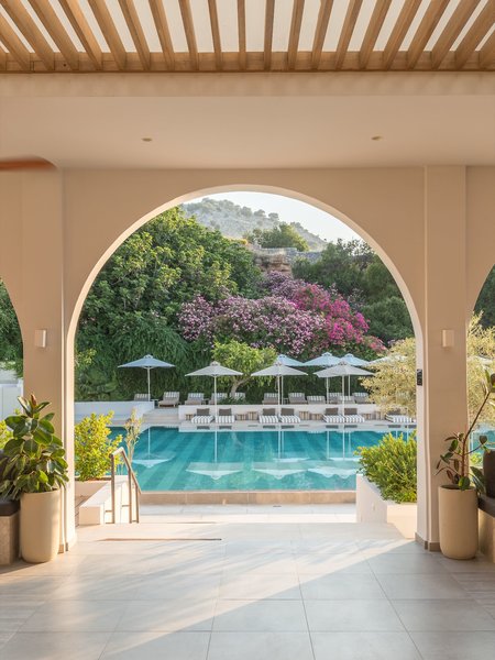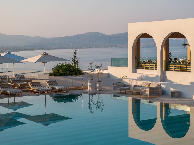 Vybavenie: Tento elegantný a nedávno zrekonštruovaný rezort ponúka 159 izieb a je postavený na rôznych poschodiach na svahu. Ponúka úžasný panoramatický výhľad na záliv, ku ktorému je prístup výťahom a lanovkou. K vybaveniu patrí recepcia, lobby s barom, Wi-Fi pripojenie v celom hoteli (v cene), hlavná reštaurácia, dve à la carte reštaurácie „Pelagos“ a „Meltemi“, ktoré podávajú grécku kuchyňu (rezervácia je nutná, niektoré za príplatok), obchod s módou a suvenírmi a kaderníctvo. V dobre udržiavaných záhradách sa nachádzajú dva sladkovodné bazény, samostatný detský bazén, bar pri bazéne, plážový bar a slnečná terasa s výhľadom na more. Lehátka, slnečníky a plážové osušky sú zahrnuté v cene pri bazéne a na pláži.