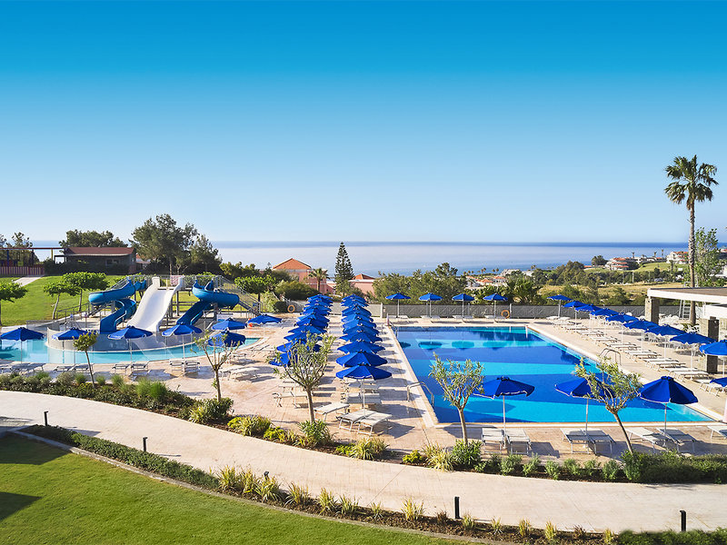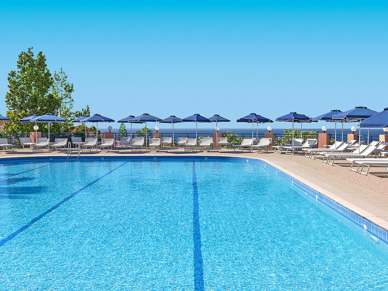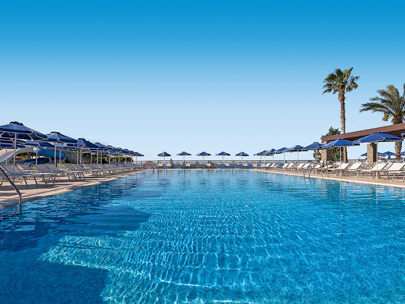 Ausstattung: Hotelanlage bestehend aus Haupthaus und einem Nebengebäude. 3 schön angelegte Swimmingpools, Sonnenterrasse, Liegen, Schirme, Badetücher am Pool/Strand, Pool-/Snackbar mit Sitzterrasse, Strandbar "Diogenis". Rezeption, WLAN (Highspeed geg. Geb.), Hauptrestaurant mit Außenterrasse, Themenrestaurant, Lobbybar. Außenbühne mit Bar. Minimarkt. Landeskat.: 4 Sterne, 197 Zimmer, 3-4 Etagen, 2 Lifte.