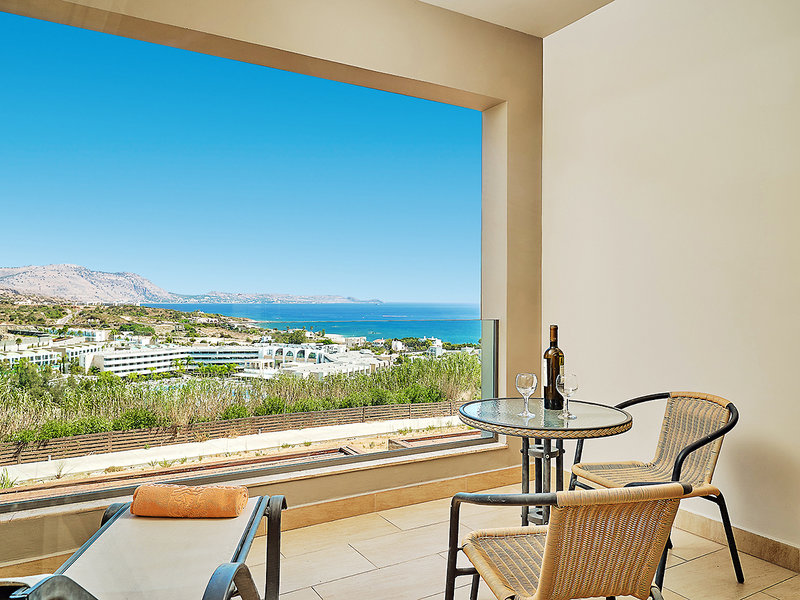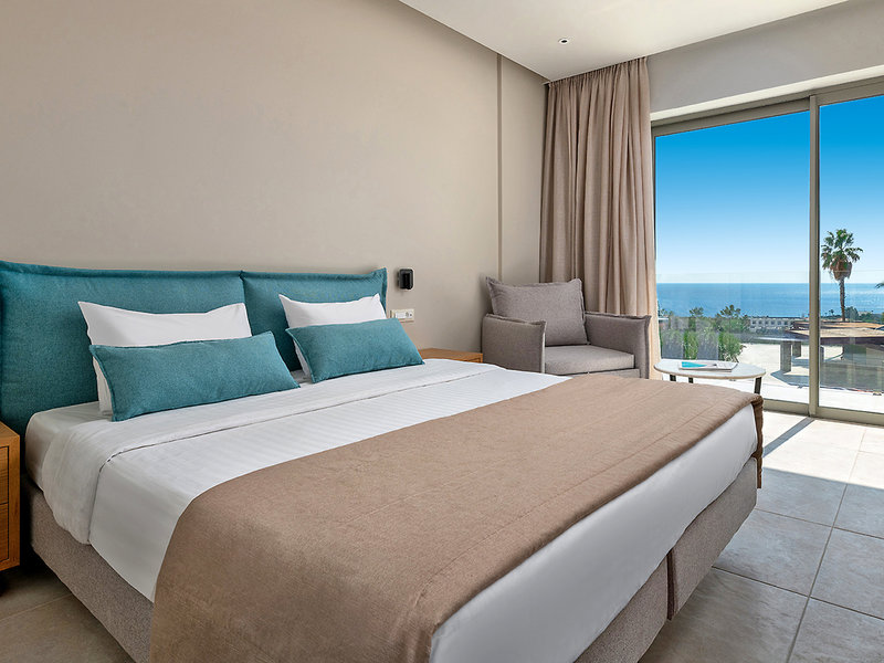 Juniorsuite (JSM, ca. 28 qm), durch Schiebetüroptisch abgetrennter Schlafbereich, Klimaanlage, Kühlschrank, Kaffee-/Teezubereiter, TV, WLAN, Telefon, Safe. Dusche, WC, Föhn. Balkon/Terrasse mit Meerblick. Max. 3E