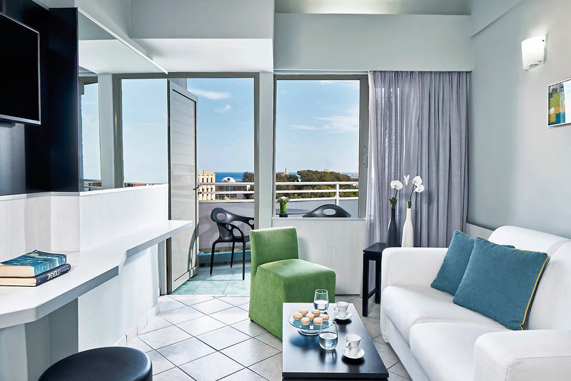 - 31-35 qm, Suite, Meerblick, renoviert, 1 separates Schlafzimmer, kombinierter Wohn-/Schlafraum, Dusche, WC, Bademantel, Badeslipper, Haartrockner, Klimaanlage, Safe, TV (Sat-TV), WLAN, Wasserkocher, Espressomaschine, Kühlschrank, Balkon (möbliert)