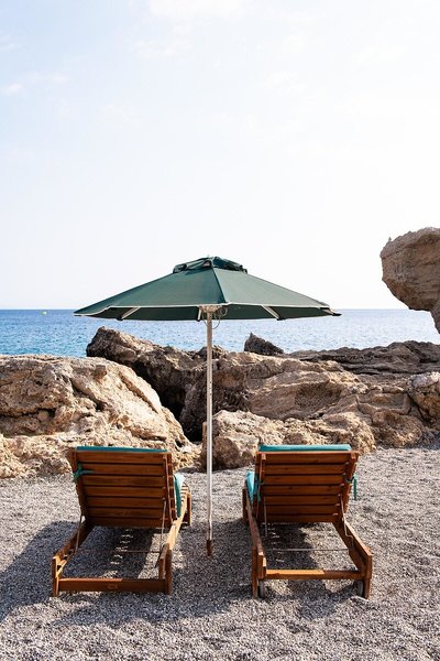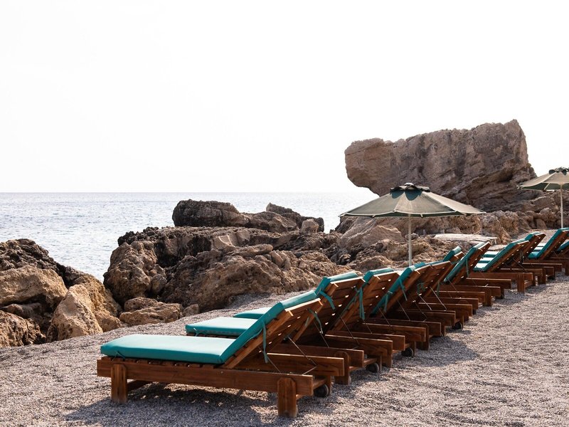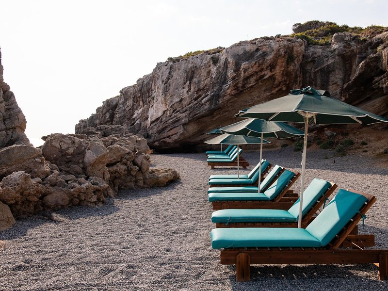 - Strand „HOTEL BEACH“: Sand, felsig, Kies, steil abfallend, naturbelassen, Treppen zum Strand, Badeschuhe empfehlenswert, öffentlich, Liegestühle, Sonnenschirme