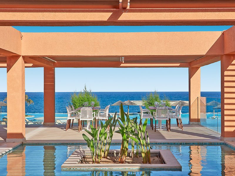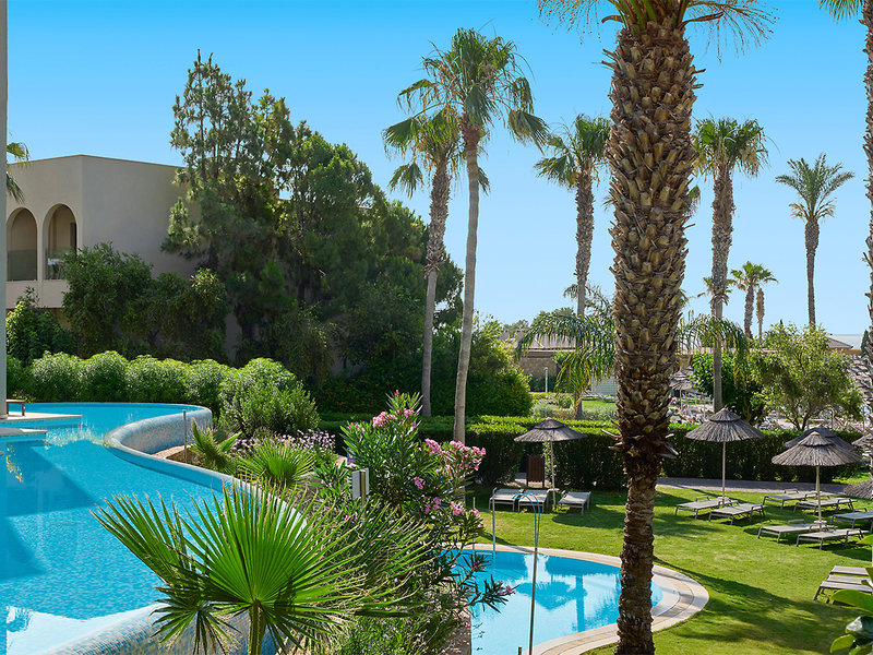 Ausstattung: In der gepflegten Gartenanlage große Swimmingpoollandschaft mit separatem Kinderbecken, Rutschen im Wasserpark, Sonnenterrassen, Pool-/Snackbar und Swim-up-Poolbar. Liegen, Schirme, Badetücher am Pool. Empfangsbereich mit Rezeption, WLAN, Hauptrestaurant, 3 À-la-carte Restaurants (italienische, griechische und asiatische Küche), Snackbar, Loungebar. Minimarkt, Souvenirshop, Boutique. Landeskategorie: 5 Sterne, 399 Zimmer.