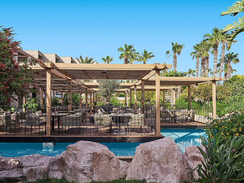 Vybavenie: Veľký bazénový komplex v udržiavaných záhradách so samostatným detským bazénom, šmykľavkami v aquaparku, slnečnými terasami, pool/snack barom a bazénovým barom. Ležadlá, slnečníky, plážové osušky pri bazéne. Recepcia s recepciou, WiFi, hlavná reštaurácia, 3 à la carte reštaurácie (talianska, grécka a ázijská kuchyňa), snack bar, lounge bar. Minimarket, obchod so suvenírmi, butik. Národná kategória: 5 hviezdičiek, 399 izieb.
