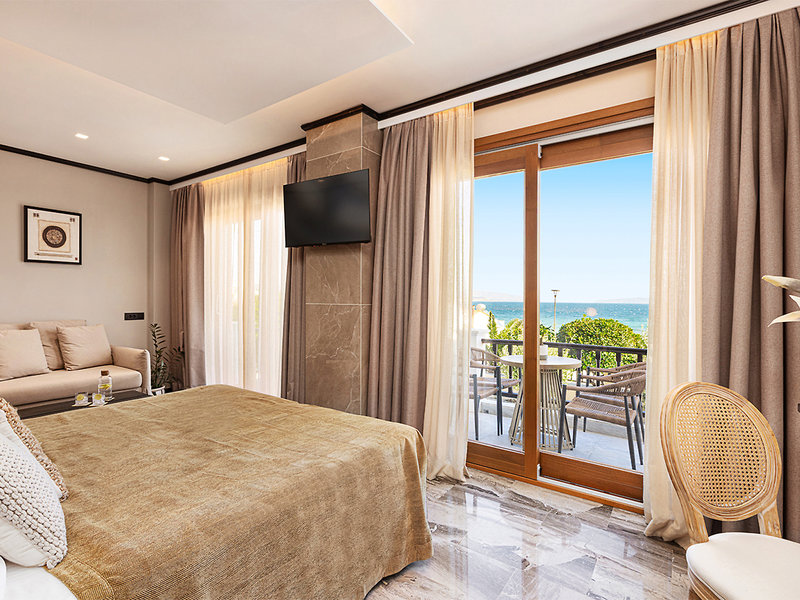 Premium-Juniorsuiten (JSP, ca. 32 qm, ab 20.04.26), renoviert, mit Klimaanlage, Kühlschrank, Nespresso®-Kaffeemaschine, TV, Safe, Regendusche, WC. Balkon mit Meerblick. Max. 3E