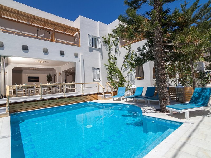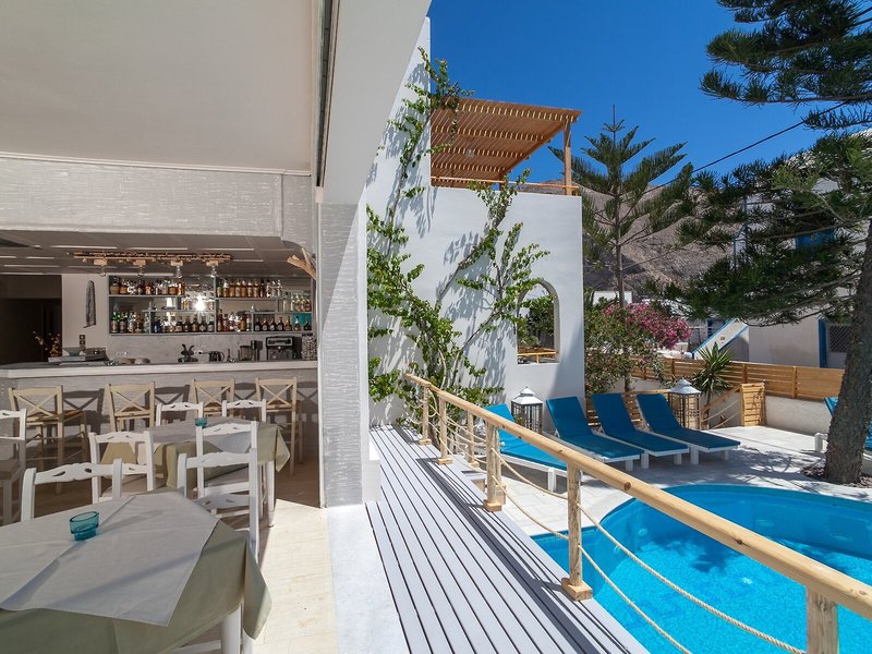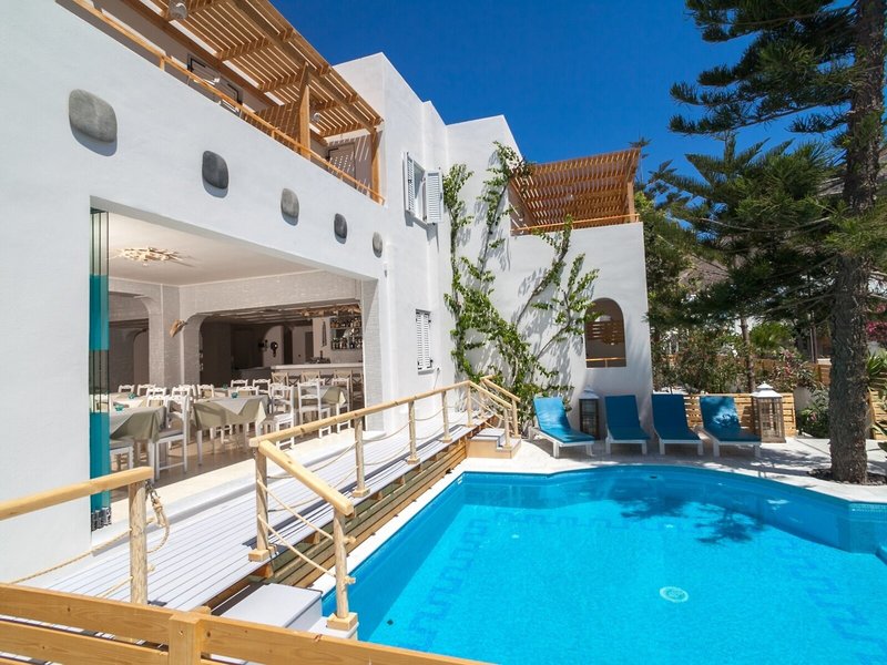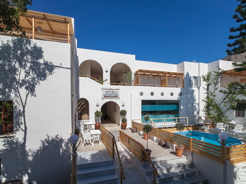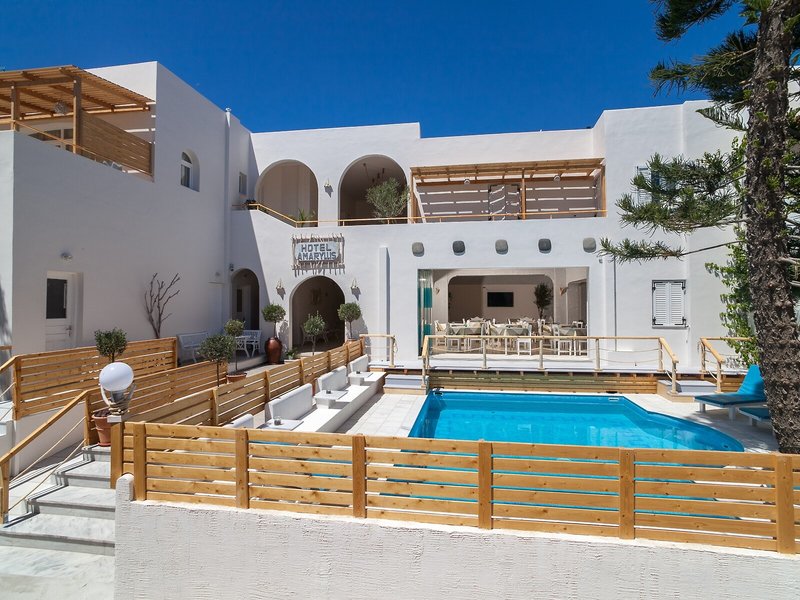 Lage & Umgebung Das Hotel befindet sich in der Nähe der wichtigsten Einrichtungen der Stadt und beliebter Strände. Zur Inselhauptstadt Fira sind es nur etwa 10 min Fahrt.