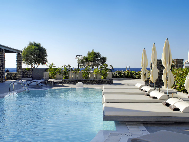 Lage & Umgebung Das Hotel liegt direkt am Perissa Beach und bietet einen eigenen Strandabschnitt mit Liegen und Sonnenschirmen. Fira liegt etwa 15 km entfernt und nach Alt-Thera sind es ca. 6 km.