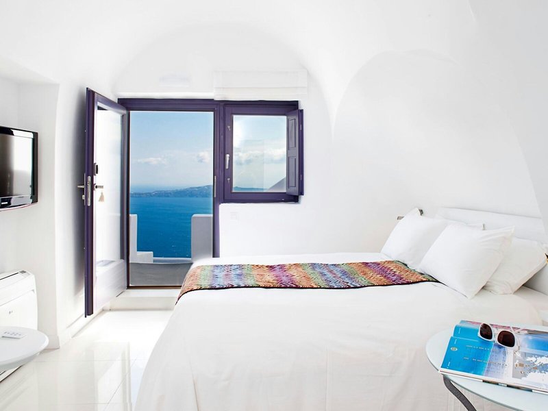 Lage & Umgebung Dieses kleine Hotel liegt am Rand eines Kraters und bietet eine schöne Sicht auf das Meer und den Vulkan. Die Unterkunft befindet sich im bekannten Dorf Imerovigli, nur rund 10 min von der Inselhauptstadt Fira mit ihren zahlreichen Bars und Nachtclubs entfernt. Die Insel Santorin ist leicht mit dem Flugzeug und mit dem Schiff zu erreichen. Der Flughafen und der Hafen Athinios liegen ca. 10 km vom Hotel entfernt.