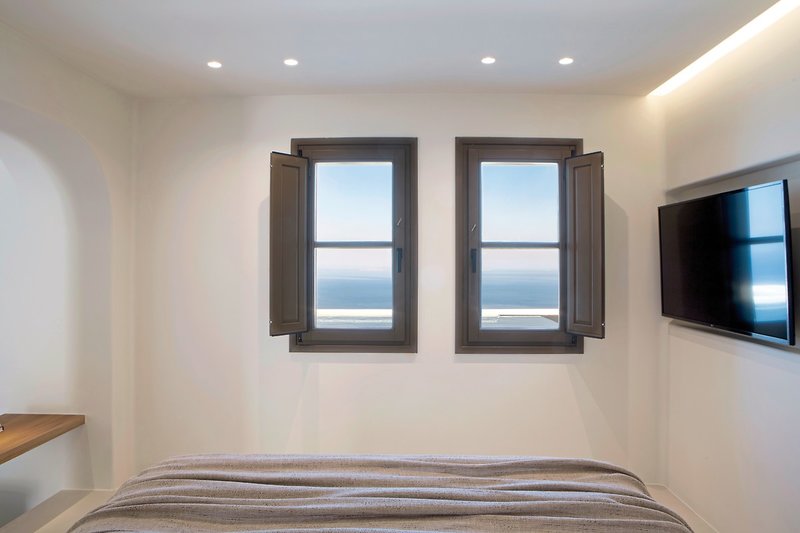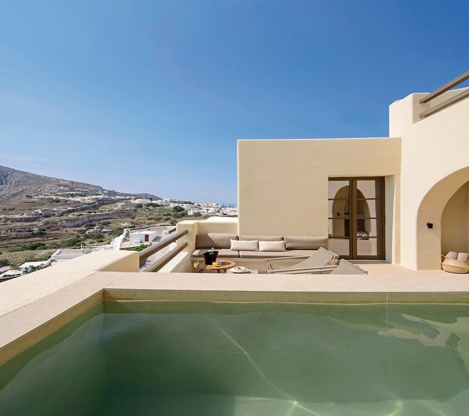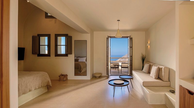 - 46-50 qm, Suite, Meerblick, Bettwäsche, Handtücher und Matratzen aus 100% Bio-Baumwolle, kombinierter Wohn-/Schlafraum, Sitzecke, Sofabett, Dusche, Bidet, WC, Bademantel, Badeslipper, Haartrockner, Klimaanlage, individuell regulierbar, Ventilator, Minibar kostenpflichtig, Safe, Bügelbrett, Bügeleisen, TV (Sat-TV), Wasserkocher, Kaffee/Tee, Terrasse (möbliert), Plunge Pool