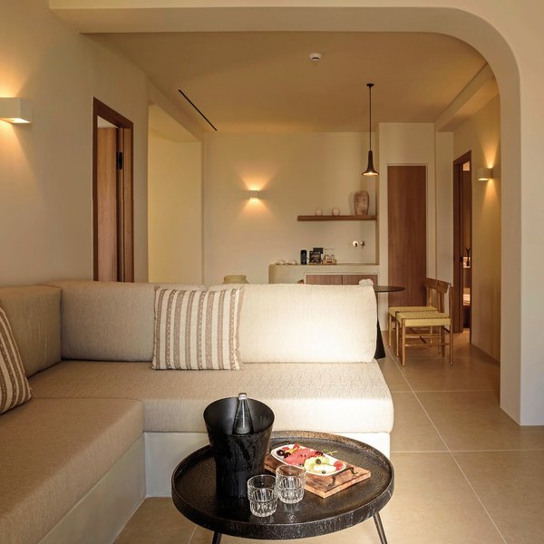 - 46-50 qm, Suite, Meerblick, Bettwäsche, Handtücher und Matratzen aus 100% Bio-Baumwolle, kombinierter Wohn-/Schlafraum, Sitzecke, Sofabett, Dusche, Bidet, WC, Bademantel, Badeslipper, Haartrockner, Klimaanlage, individuell regulierbar, Ventilator, Minibar kostenpflichtig, Safe, Bügelbrett, Bügeleisen, TV (Sat-TV), Wasserkocher, Kaffee/Tee, Terrasse (möbliert), Privatpool