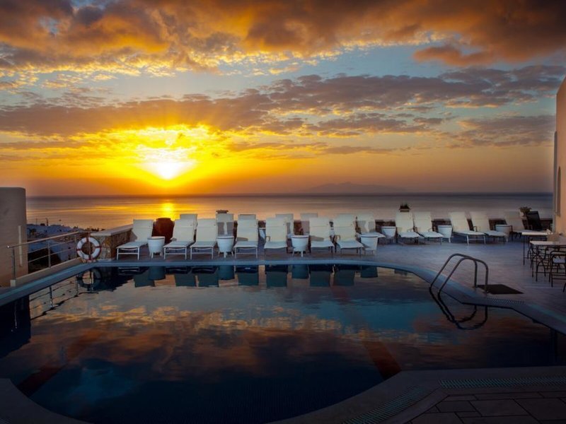 Lage & Umgebung Das Hotel liegt am Fuße des Berges, auf dem auch die alte Stadt Fira liegt. Der Strand von Kamari, einer der besten von Santorin, ist gut zu Fuß zu erreichen.