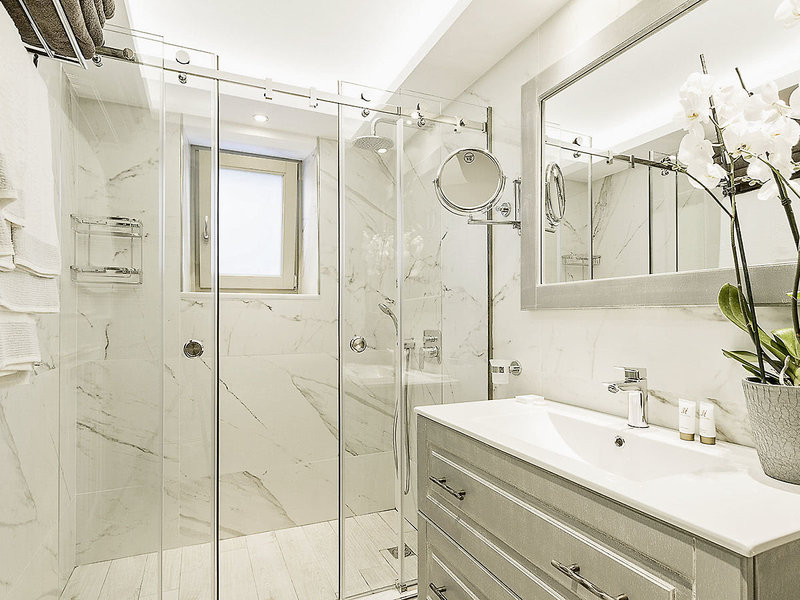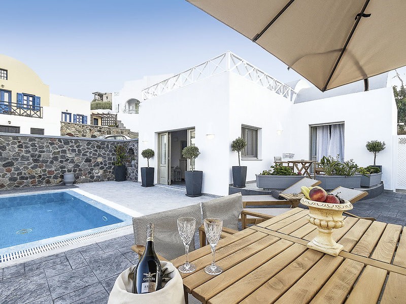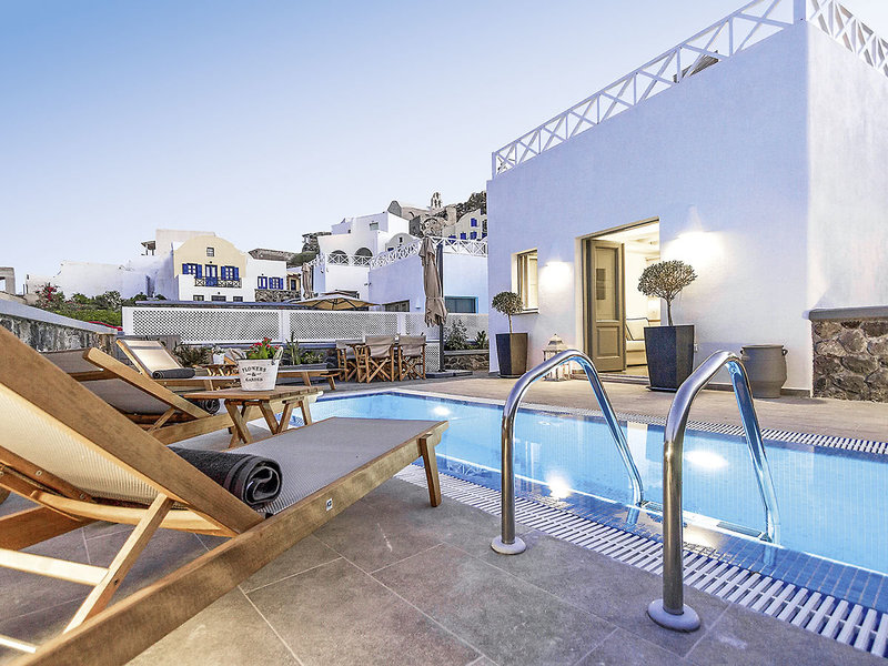 Wohnen: Villa (VI, ca. 65 qm), Klimaanlage in den Wohn- und Schlafräumen, voll ausgestattete Küche mit Kühlschrank, WLAN (inklusive), TV, Telefon und Safe. Dusche, WC und Föhn. Bademäntel, Slipper. Balkon oder Terrasse. Landblick. Privater Pool. Max. 4E