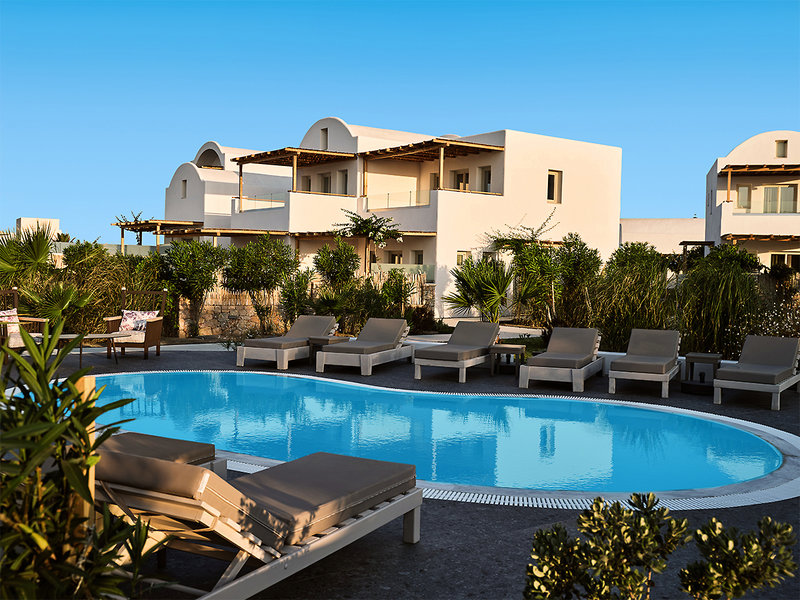 Lage: Direkter Zugang zum vulkanischen schwarzen Sandstrand. Zum Fährhafen Athinios sind es ca. 10 km, zum Flughafen Thira ca. 13 km.