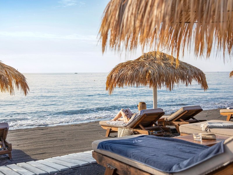 - Strand „Black Sandy Beach“: dunkler Sand, Liegen, Sonnenschirme