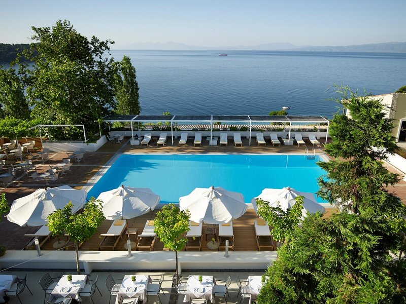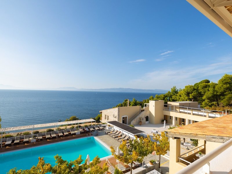 Lage & Umgebung Auf einem mit Kiefern bewachsenen Hügel gelegen, thront das Hotel über dem malerischen Sandstrand von Agia Paraskevi und bietet atemberaubenden Meerblick. Das Ortszentrum von Skiathos befindet sich in ca. 9 km Entfernung. Der beliebte Strand Koukounaries liegt etwa 5 km entfernt. Eine Straße trennt das Hotel vom Strand.