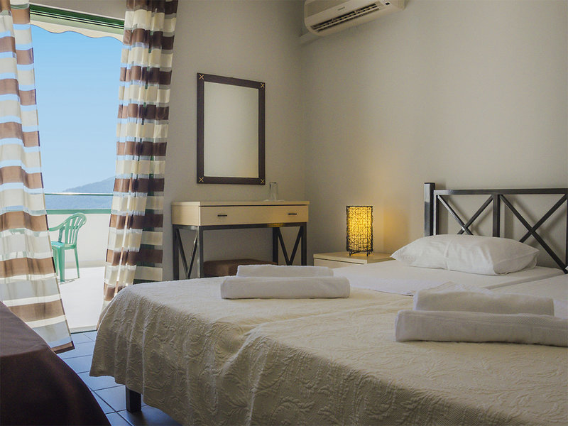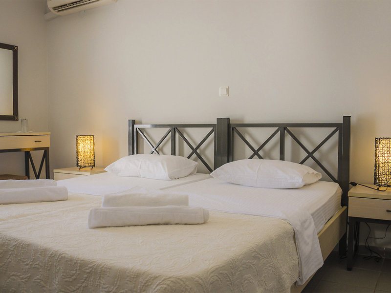 Poloha: Približne 300 m nad mierne sa zvažujúcou piesočnatou plážou ponúka úchvatný výhľad na celý záliv. Vďaka svojej polohe na svahu si môžete vychutnať jedinečnú súhru mora a krajiny. V blízkosti sa nachádzajú útulné taverny, bary a malé supermarkety. Horská dedinka Panagia s autentickým šarmom je vzdialená asi 4,5 km a pozýva vás na idylické objavovanie.