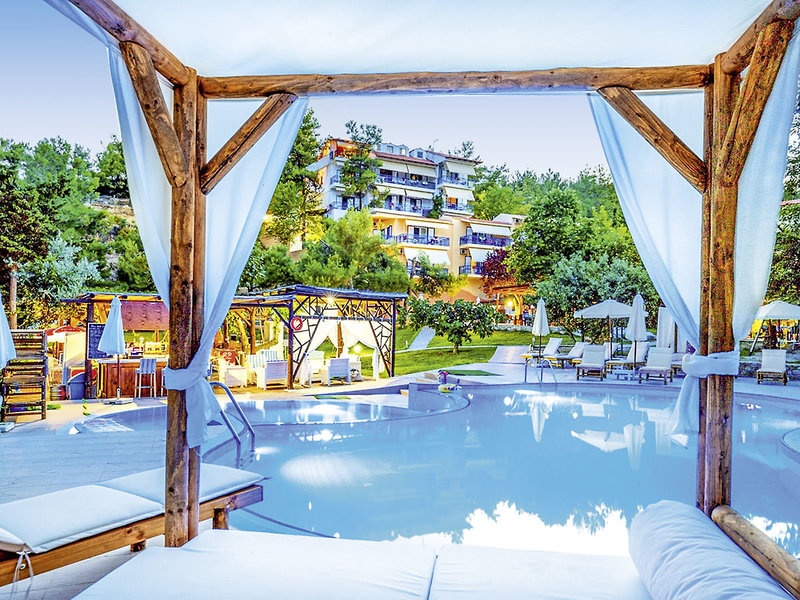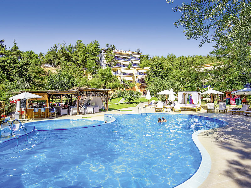 Lage: Ruhig an einem Hang, mit wunderschönem Blick auf das Meer. Nur 40 m vom fantastischen, naturbelassenen Sandstrand entfernt. Zum Zentrum von Limenaria sind es ca. 2,5 km. Bushaltestelle ca. 300 m oberhalb des Hotels.