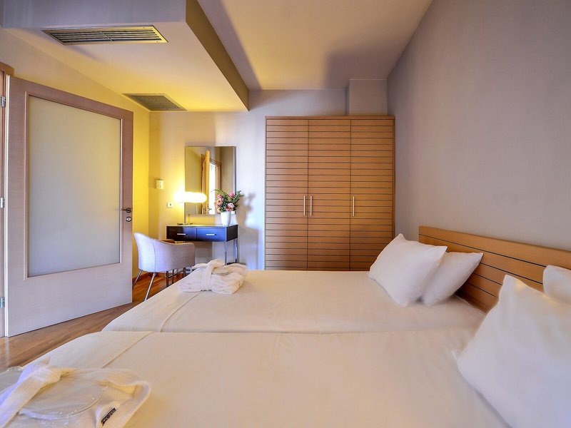 So wohnen Sie: Für angenehmes Raumklima in den Zimmern sorgen eine Klimaanlage und eine individuell steuerbare Heizung. Ein Balkon oder eine Terrasse ist in den meisten Zimmern vorhanden. Die Zimmer verfügen über ein Doppelbett und ein Sofabett. Zustellbetten können angefordert werden. Außerdem sind ein Safe, eine Minibar und ein Schreibtisch verfügbar. Eine Hosenpresse ist für den zusätzlichen Komfort der Gäste verfügbar. Darüber hinaus sind ein Telefon mit Direktwahl, ein TV-Gerät mit Satelliten-/Kabelempfang, ein Wecker und WiFi (ohne Gebühr) vorhanden. Die Gäste können den abendlichen Gute-Nacht-Service in Anspruch nehmen. Zu den Vorzügen der Zimmer gehören Hausschuhe. Die Badezimmer sind ausgestattet mit einer Dusche, einer Badewanne und einer Whirlwanne. Für den täglichen Gebrauch stehen ein Haartrockner und ein Telefon zur Verfügung. Als Besonderheit genießen die Gäste in den Badezimmern Kosmetikartikel und eine Auswahl an Handtüchern. Buchbar sind rollstuhlgerechte Zimmer. Die Unterbringung bietet Familien- und Nichtraucherzimmer.