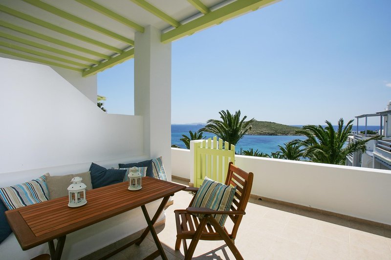 - Balkon oder Terrasse mit Blick auf das Meer und die Inseln Mykonos und Delos