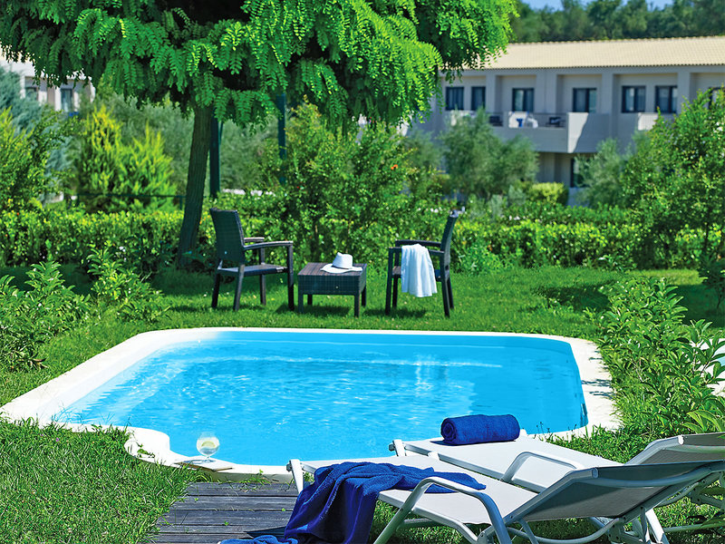 Familienzimmer (FZP, ca. 36 qm), Klimaanlage, Minikühlschrank, Kaffee-/Teezubereiter, WLAN, TV, Telefon, Mitsafe. Dusche, WC, Bademäntel, Föhn. Terrasse mit privatem Pool. Max. 3E/2E+2K