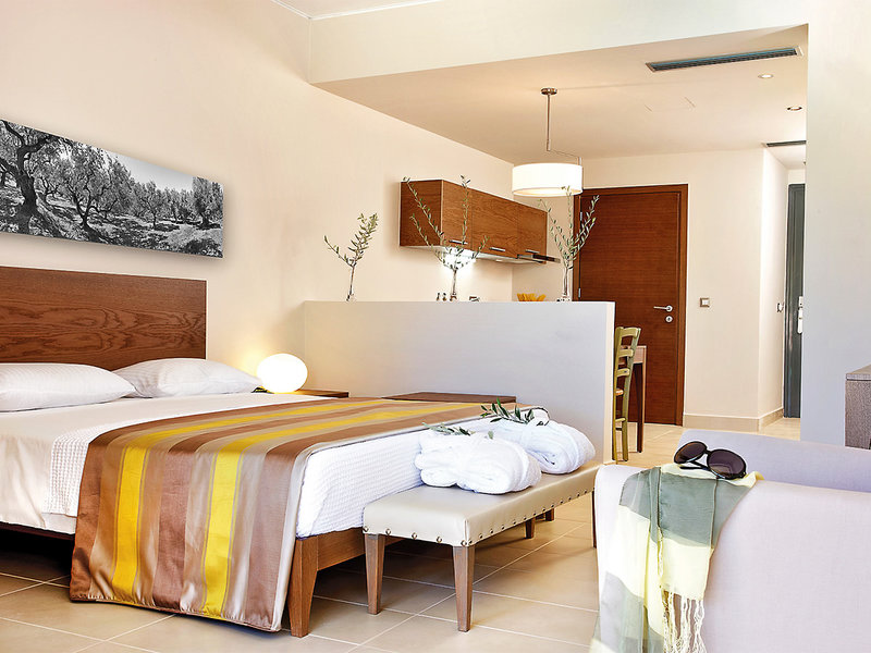 Juniorsuite (JS, ca. 36 qm), Klimaanlage, Minikühlschrank, Kaffee-/Teezubereiter, WLAN, TV, Telefon, Mitsafe. Bad, WC, Bademäntel, Slipper, Föhn. Terrasse. Seitlicher Meerblick. Max. 3E/2E+2K