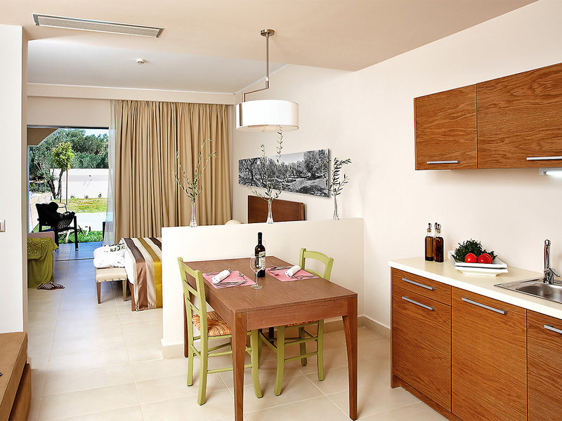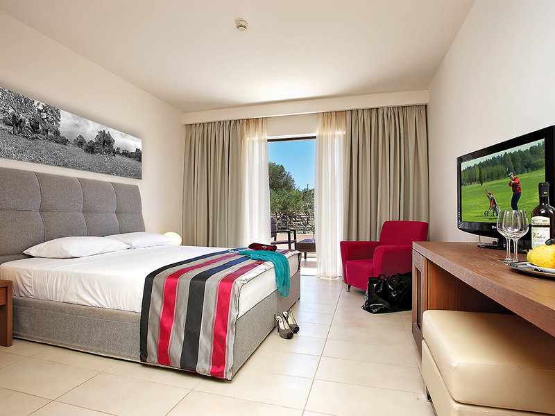Junior Suite (JS, cca 36 m²), klimatizácia, minichladnička, kávovar/čajník, Wi-Fi, TV, telefón, trezor. Kúpeľňa, WC, župany, papuče, fén. Terasa. Čiastočný výhľad na more. Max. 3 dospelí/2 dospelí + 2 deti